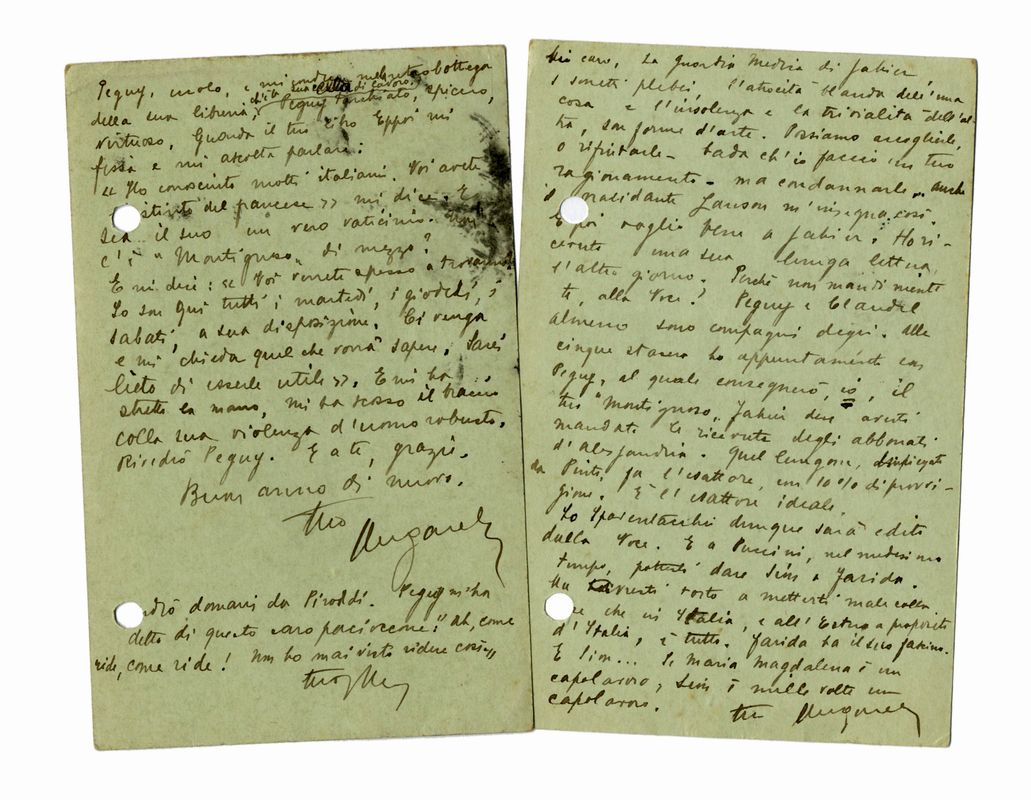 Manoscritti a inchiostro nero. Due “Cartes postales” inviate da Rue de Carmes 5, scritte 2 pagine. Fori di raccoglitore. Dimensioni mm 90x140.