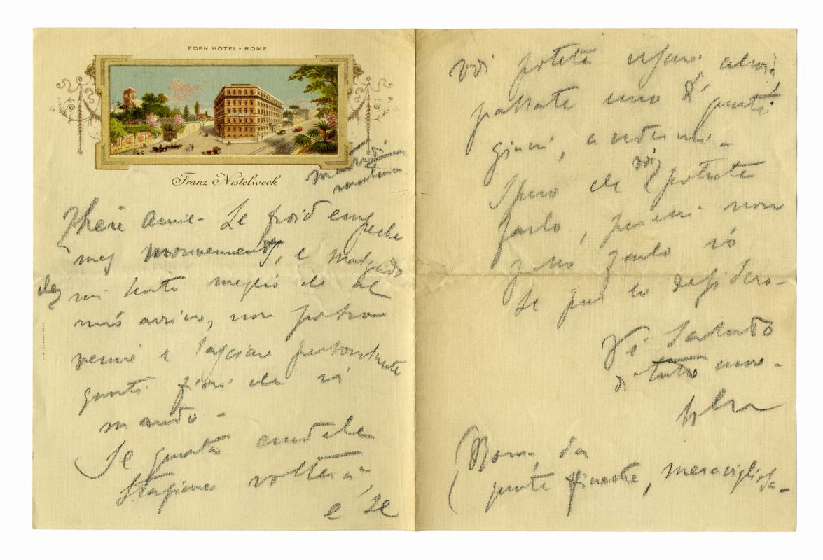 Manoscritti a inchiostro viola e matita nera su bifoli, uno su carta intestata “Eden Hotel - Rome”. Testi in italiano con frasi in francese. 6 pagine scritte in totale. Dimensioni: 180/210x130 mm