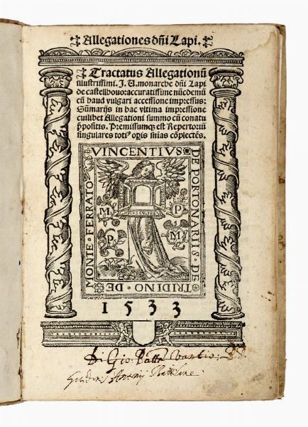 In-8° (mm 180x117). Carte [12], CXXVI, [1]. Frontespizio entro cornice architettonica xilografata, con marca tipografica in legno riprodotta anche al recto dell'ultima carta; capilettera xilografici. Ampie gore, concentrate principalmente a inizio e fine di volume, lievi arrossature e fioriture sparse. Un piccolo restauro marginale al frontespizio; sempre al frontespizio due note di possesso manoscritte, di cui una cassata. Legatura coeva in piena pergamena, con titoli manoscritti al dorso a tre nervi e al piatto anteriore; mancanze e difetti. Sguardie rinnovate.