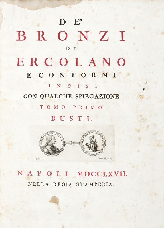 6-7) De' bronzi di Ercolano e contorni incisi con qualche spiegazione. Tomo primo Dei busti. (-Tomo secondo Statue). Napoli: nella regia stamperia, 1767-1771. 2 volumi in-folio (mm 470x353). Pagine [4], XLV, 1 bianca, 280, [10], 2 bianche, 35, [2] con 1 tavola fuori testo; [4], XI, [1], 423, [15] con 1 ritratto di Carlo III in principio di volume. Con nel complesso 2 tavole fuori testo e oltre 180 illustrazioni nel testo, di cui alcune più volte ripiegate. Primo volume con bruniture e arrossature alle carte, più concentrate in alcuni fascicoli; fioriture e bruniture nel secondo.