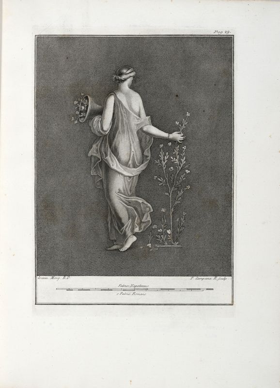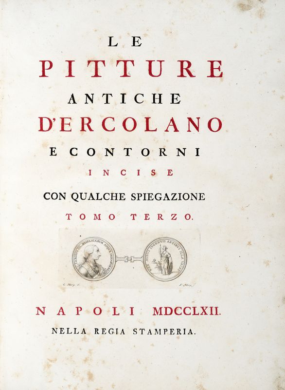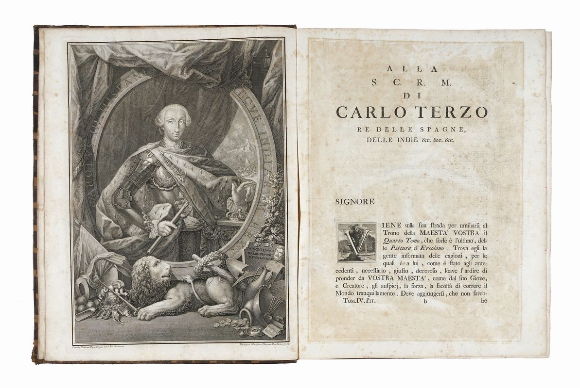 2-5) Le pitture antiche d'Ercolano e contorni incise con qualche spiegazione. Tomo primo (-quarto). Napoli: nella regia stamperia, 1757-1765. 4 [di 5] volumi in-folio (mm 471x360). Pagine [8], 279, [9] con 1 antiporta calcografica, 1 ritratto del Dedicatario e 1 tavola a doppia pagina con il Cratere maritimo o parte del Golfo di Napoli; [14], 349, [11] con 1 ritratto del Dedicatario in principio di volume; [4], XVII, 1 bianca, 339, [13] con 1 ritratto del Dedicatario; [4], X , 368, [12] con 1 ritratto del Dedicatario in antiporta. Con nel complesso 6 tavole fuori testo e oltre 200 illustrazioni calcografiche nel testo. Alcune pagine brunite, fioriture e una gora marginale al primo volume.