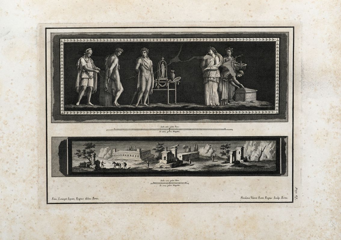 1) Catalogo degli antichi monumenti dissotterrati dalla discoperta città di Ercolano.... 1755. In-folio (mm 477x355). Pagine [4], XXII, 447, 1 bianca. Ampio fregio calcografico al frontespizio con stemma; capilettera, testatine e finalini incisi in rame. Gora nel margine superiore delle prime carte di volume, molte pagine con arrossature e fioriture. Legatura coeva in piena pelle spruzzata con titolo in oro su tassello al dorso. Decorazioni dorate ai comparti. Tagli rossi.