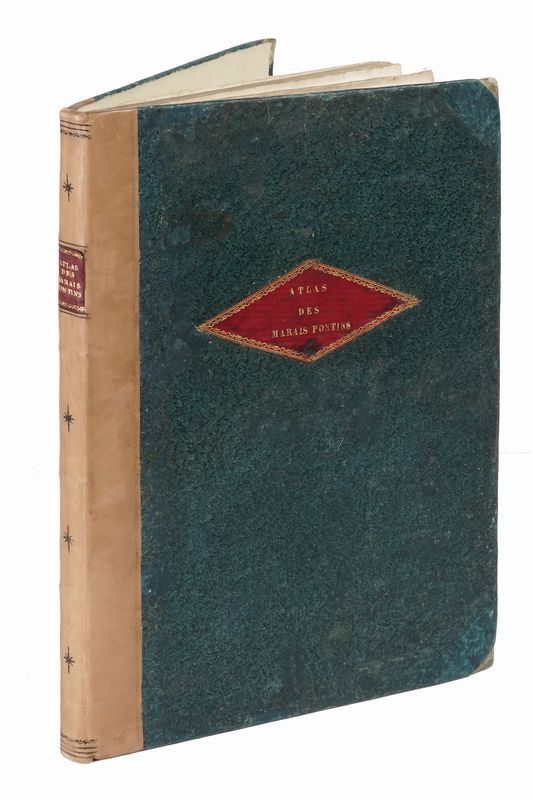 In folio (mm 410x270). Pagine VIII con 39 tavole fuori testo ripiegate o a doppia pagina. Alcune carte fortemente brunite, occasionali fioriture e un lavoro di tarlo nel margine superiore (senza perdita di inciso) di 5 carte. Legatura successiva in mezza pelle con punte e piatti in carta antica, tasselli originali con titoli impressi in oro applicati al dorso e al piatto anteriore. Al contropiatto anteriore due ex-libris di precedenti proprietari.