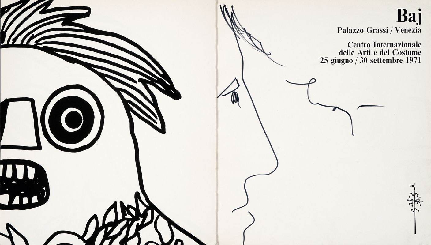 In-8° (mm 235x205). Catalogo della mostra su Enrico Baj, allestita a Palazzo Grassi a Venezia nel 1971, riccamente illustrato con riproduzioni di opere o fotografie dell'Artista in bianco e nero e a colori. Al frontespizio, un disegno originale a pennarello firmato da Baj. Brossura editoriale originale in mezza tela, con piatti in cartoncino illustrato e sguardie decorate.