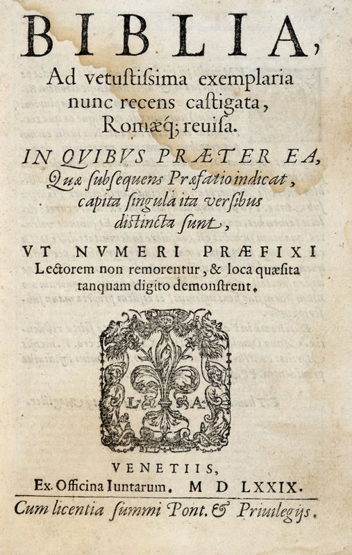 In-8° (mm 174x117). Carte [8], 552, [11] (di 12). Marca xilografica dei Giunta al frontespizio e al colophon; vignette e capilettera in legno. Testo entro cornice. Un'ampia gora al margine superiore di gran parte del volume; fioriture, bruniture e macchie sparse. Mancante la carta 4B3. Legatura successiva in mezza pelle, con piatti decorati e titoli in oro al dorso; sguardie rinnovate. Segni di usura agli angoli.