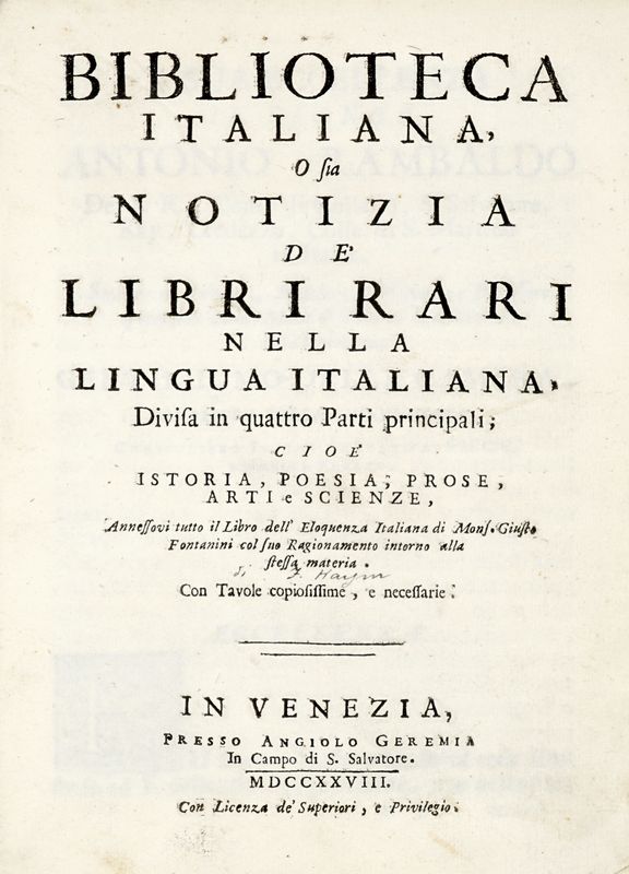 Biblioteca italiana, o sia Notizia de' libri rari nella lingua italiana, divisa [..]