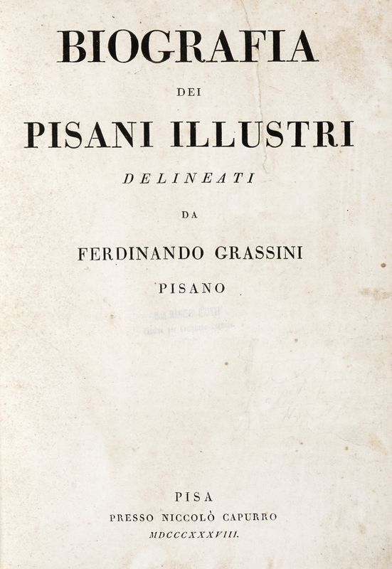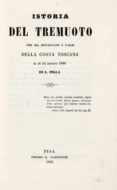 In-4° (mm 314x215). Con 82 tavole, accompagnate da alcune carte di testo descrittivo. Uno strappo maldestramente restaurato al frontespizio, alla carta di Introduzione e alla prima tavola. Diffuse fioriture e bruniture concentrate principalmente alle carte di testo. Legatura coeva in piena pelle con fregi e titoli in oro e a secco al dorso; sguardie rinnovate. SI AGGIUNGE: Pilla Leopoldo, Istoria del tremuoto che ha devastato i paesi della costa toscana il di 14 agosto 1846… Pisa: Presso R. Vannucchi, 1846. In-8° (mm 222x138).