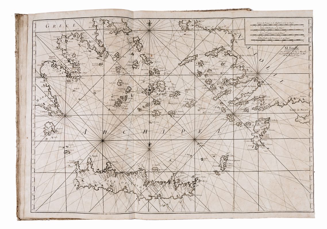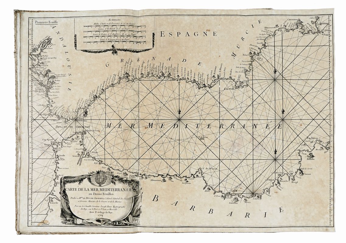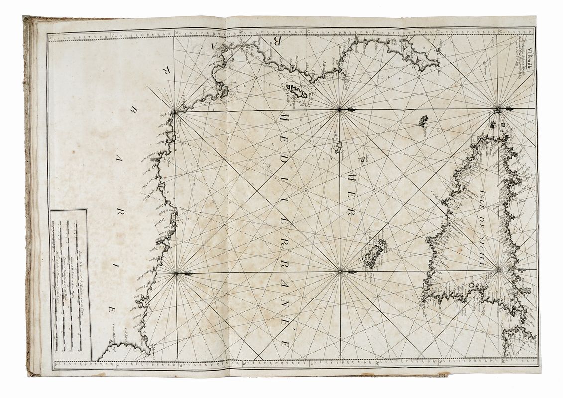 In-folio (mm 595x330). 14 carte geografiche incise in rame a doppia pagina e ripiegate (mm 600x530) montate su brachette. Carte uniformemente brunite, un restauro al verso della tavola V, strappi marginali ad alcune tavole, di cui uno strappo all'ultima ma opera arricchita dalla presenza di 2 carte aggiuntive rispetto all'edizione: la Carte du Golfe de Lyon (Marseille, 1771) e la Carte particuliere del costes de Provence (Marseille 1770), legate in fine. Legatura coeva in pieno cartonato rustico. Gravi difetti ai piatti.