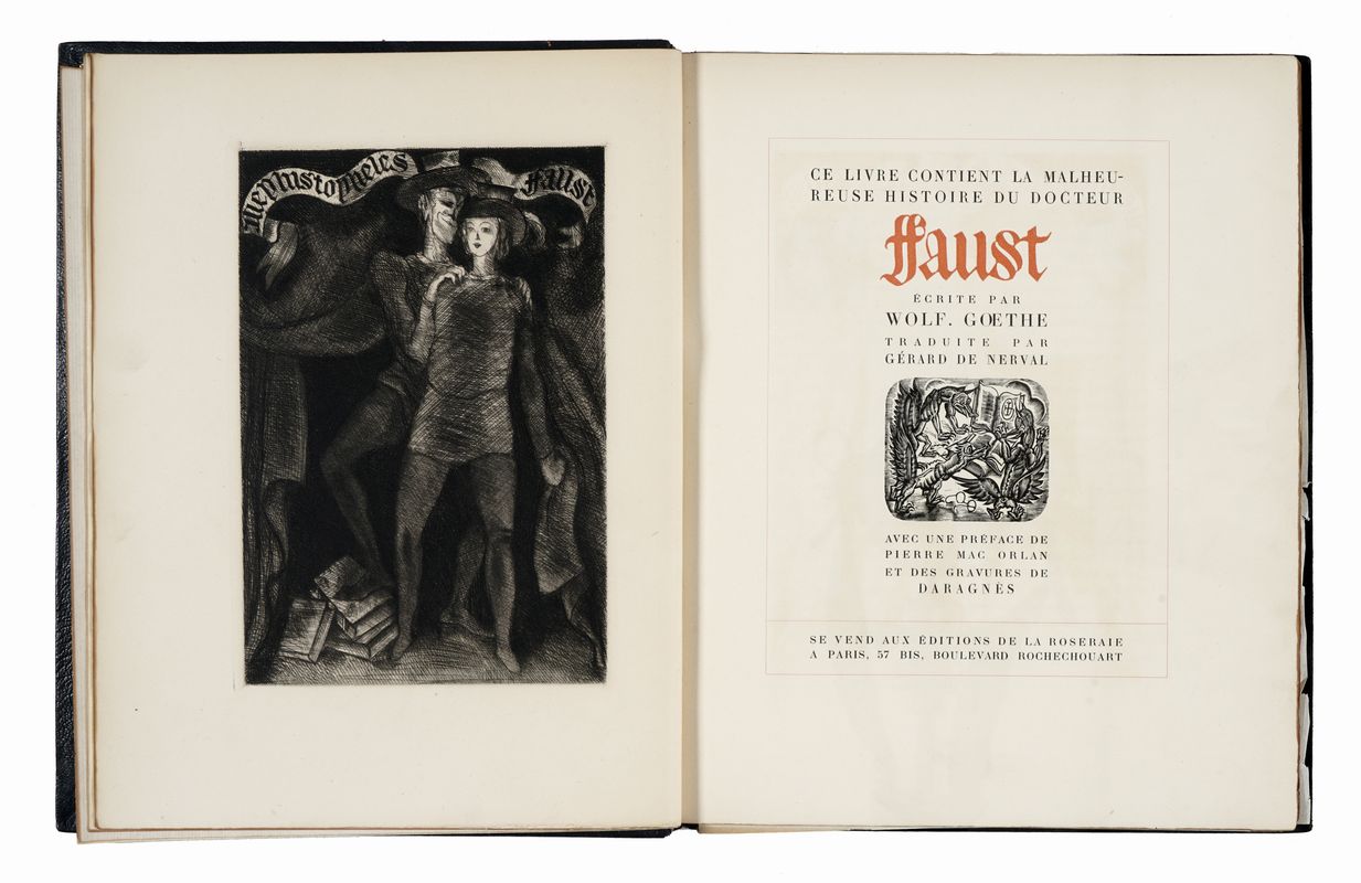 In-4° (mm 278x220). Con 12 belle incisioni fuori testo, di cui una in antiporta, tutte protette da velina, tranne quest'ultima. Numerosi legni nel testo. Ottimo esemplare, perfettamente conservato nelle sue barbe, col testo entro cornice tipografica rossa. Legatura coeva in piena pelle, firmata da G. Schroeder, con titolo in oro entro cornice di filetti dorati al piatto anteriore; titoli in oro al dorso e sguardie in bella carta decorata ritoccata a mano. Difetti alle cerniere. Esemplare n. 227, su una tiratura complessiva di 439, uno dei 350 in-4° coquille sur papier de Rives.