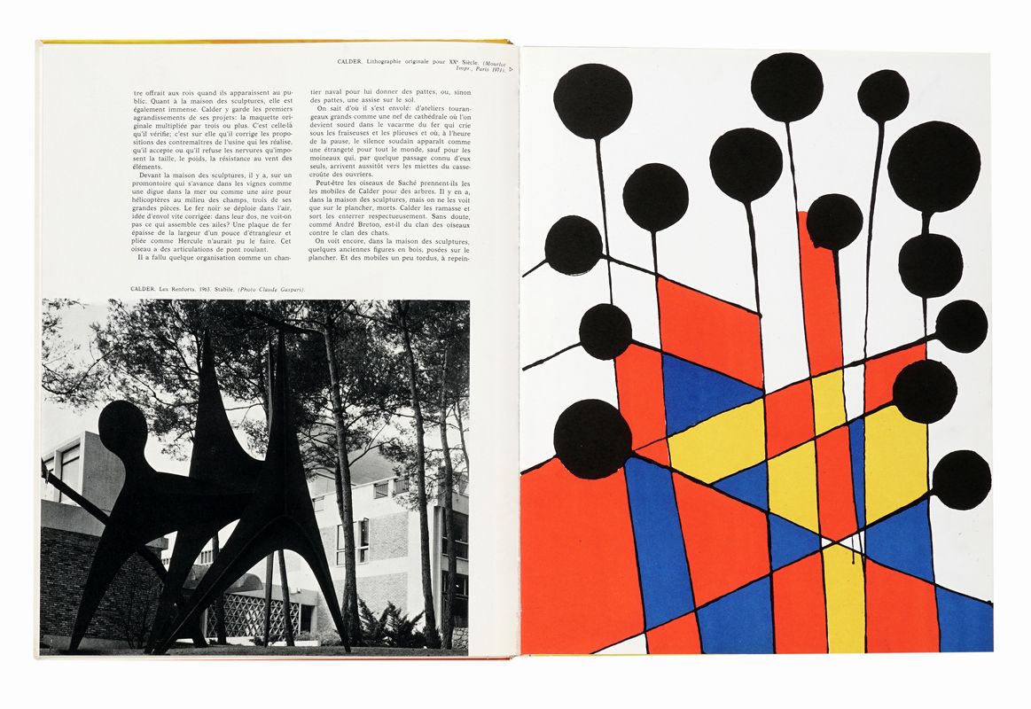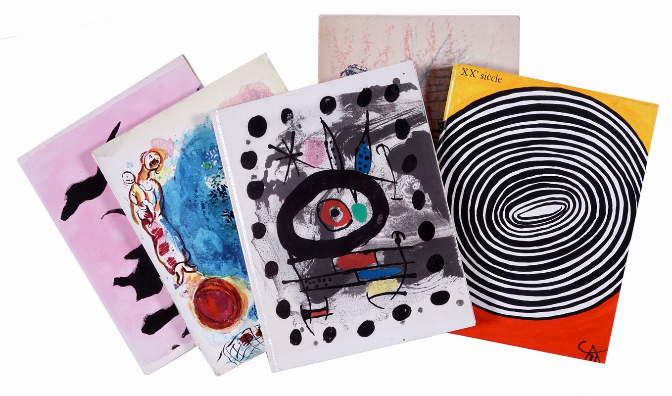Compongono il lotto: 1) XXe Siècle: XXIVe année, n.20. Noël 1962. In-4° (mm 317x243). Con tre litografie originali a colori di Max Ernst, Enrico Baj e Alfred Manessier. Brossura editoriale illustrata con titoli al dorso. Lievi mancanze alle cuffie; 2) XXe Siècle: XXVI année, n.23. Mai 1964. In-4° (mm 317x243). Una litografia originale di Max Ernst al piatto anteriore della brossura editoriale. Quest'ultima completamente staccata all'interno e con difetti al dorso. 3) XXe Siècle: XXIIIth year, n.17. Christmas 1961. In-4° (mm 317x243). Con 1 litografia originale a colori di Karel Appe. Brossura editoriale illustrata al piatto anteriore da Marc Chagal. Difetti e mancanze al dorso e ai piatti. 4) XXe Siècle: XXIXe année, n.28. Noël 1967. In-4° (mm 312x238). Con 2 litografie originali a colori di Marino Marini e Joan Miró, quest'ultima a tripla pagina. Bella legatura editoriale illustrata in pieno cartonato. 5) XXe Siècle: XXXIIIe année, n.37. Décembre 1971. In-4° (mm 312x238). Con due litografie originali a colori di Calder e Zao Wou-ki e una serigrafia a tripla pagina di Yaacov Agam. Ottimo esemplare in legatura editoriale illustrata in pieno cartonato