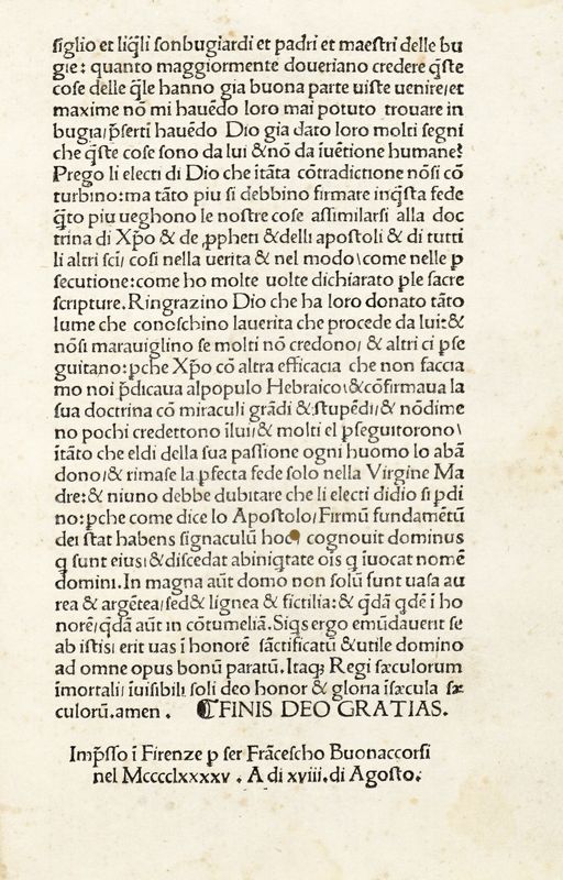 In-4° (mm 200x130). Carte [54]. Segnatura: a-d? e-g? h?. Carattere 88 R, testo su 32 e 34 linee. Esemplare come di consueto privo della tavola fuori testo. Alcune macchie, un piccolo forellino di tarlo che attraversa il testo, parzialmente staccato il primo fascicolo. Legatura ottocentesca in mezza pelle con punte e piatti in percallina. Titolo in oro al dorso.