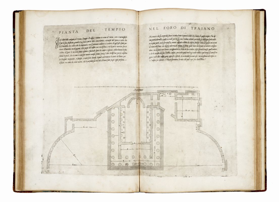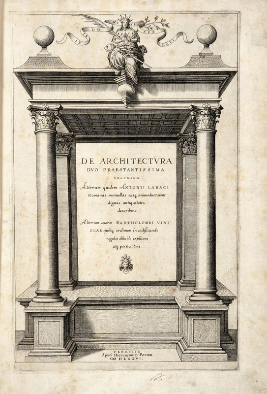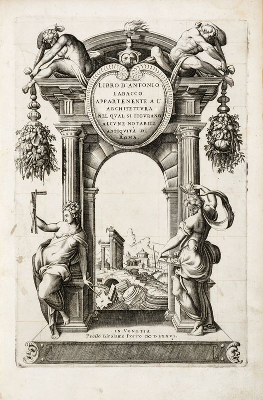 2 parti in 1 volume in folio (mm 393x260). Carte [3] e 29 tavole a piena pagina numerate IIII-XXXII. Frontespizio calcografico. SEGUE: Libro d'Antonio Labacco appartenente a l'architettura nel qual si figurano alcune notabili antiquità di Roma. In Venetia: presso Girolamo Porro, 1576. Carte [1] di [2] con 28 tavole (di cui 2 rilegate) numerate 3-30. Assente la carta Alli lettori dopo il frontespizio, restauri alle carte ripiegate. Legatura successiva in mezza pelle con punte e piatti in carta marmorizzata. Titolo in oro al dorso, sguardie in carta marmorizzata.