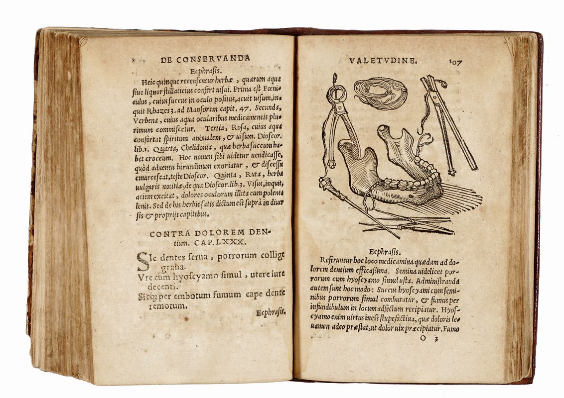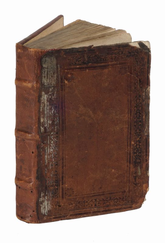 In-8° (mm 153x100). [8], 147, [5]. Numerose xilografie nel testo. Copia con usuale brunitura della carta. Gore a parte dei fascicoli, un forellino di tarlo alle prime 4 carte di testo, ma testo completo di testo e immagini. Legatura successiva con applicati i piatti della legatura originale in piena pergamena con impressioni a secco ai piatti. Mancanze lungo le unghiature.