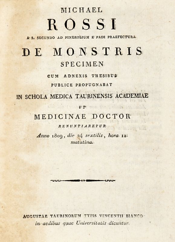 2 opere in 1 volume in-4° (mm 201x153). Pagine 38. Assente l'ultima carta (bianca), lieve brunitura sul frontespizio. LEGATO CON: Chiochetti Guglielmo, De graviditate specimen medico-legale... Augustae Taurinorum: Typographia Vincentii Bianco in aedibus dictis Archigymnasii, 1809. Pagine 42, 2 bianche. Legatura moderna in carta decorata.