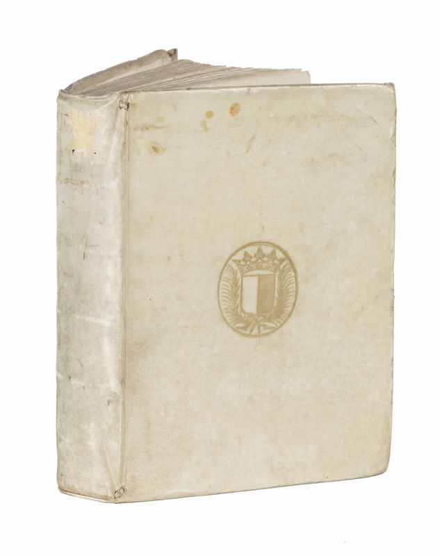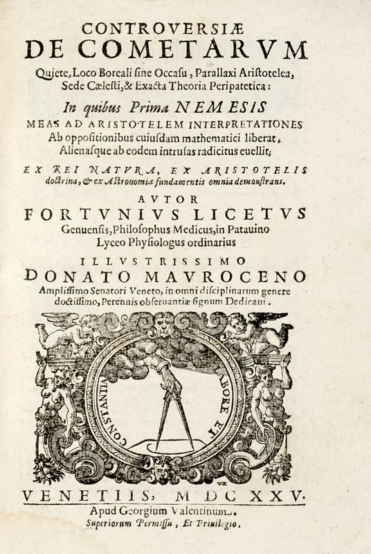 In-4° (mm 221x156). Pagine [54], 410, [1] di Errata, 1 bianca. LEGATO CON: Id., Controversiae de cometarum quiete, loco boreali sine occasu, parallaxi Aristotelea, sede caelesti, et exacta theoria peripatetica. Venetiis: apud Georgium Valentinum, 1625. Pagine [24], 77, [1]. Alcune macchie alla carta 2L2 del primo volume, lieve gora d'acqua nel margine inferiore dei fascicoli. Legatura successiva in piena pergamena con titolo manoscritto al dorso e stemma impresso in oro al centro di ciascun piatto.