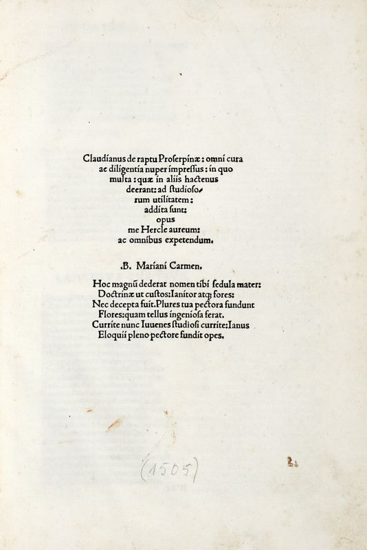 In folio (mm 303x204). Carte [8], LII. Macchie al fascicolo F, gore marginali nella seconda metà dei fascicoli, sporadiche fioriture. Legatura moderna in pieno cartonato realizzato con carta marmorizzata antica. Nota manoscritta al verso dell'ultima carta.