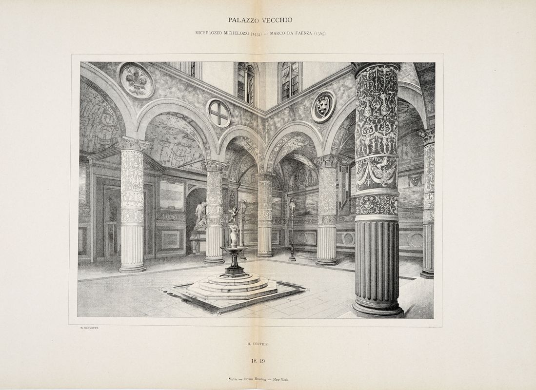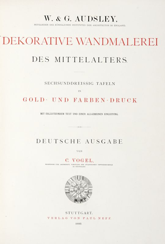 In-folio (mm 401x282). Pagine VIII, carte [33] + 36 cromolitografie a piena pagina fuori testo. Frontespizio in rosso e nero e sguardie in carta decorata. Legatura editoriale in mezza tela con piatti in carta con titoli e motivi decorativi in oro, rosso, verde e blu e titoli impressi in nero al dorso. Tagli rossi. SI AGGIUNGONO: Schütte Hermann, Ornamentale und Architektonische Studienblätter aus Italien... Berlin: Bruno Hessling, [1900]. In-folio (mm 400x290). Carte sciolte [4] con frontespizio e testo esplicativo + 49 tavole litografiche a piena pagina di cui una doppia numerate da 1 a 50 con vedute di palazzi rinascimentali fiorentini. Cartella editoriale in mezza tela rossa con angoli e piatti in cartonato con titoli impressi in nero. Laccetti di chiusura. Mancanze al dorso. Schübler Johann Jacob, Intérieurs und Mobiliar des XVIII. Jahrhunderts... Wien: Anton Schroll & Co., 1885. In-folio (mm 400x269). Pagine sciolte [4], III, [1] con frontespizio e testo esplicativo + 25 tavole litografiche a piena pagina. Cartella editoriale in mezza tela con punte e piatti in percallina con titoli impressi in nero. Laccetti di chiusura sui tre lati. Dorso parzialmente staccato.