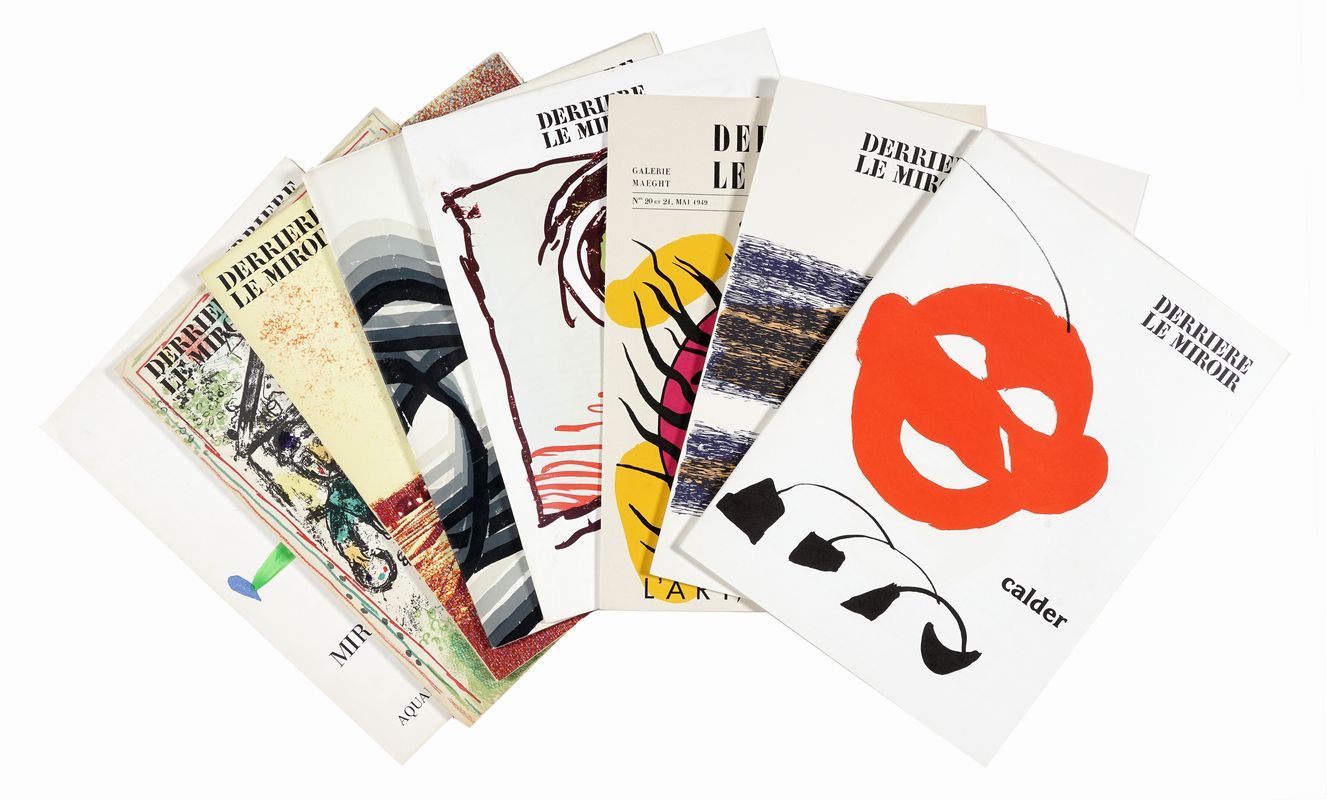 7 numeri in 7 fascicoli sciolti in-folio (mm 379x280). ll lotto si compone del n. doppio 20-21 del 1949: L'art Abstrait. Con 2 litografie a colori di Fernand Léger, di cui una a doppia pagina e una al piatto anteriore e 2 (di 3) litografie a colori di Jean Arp, di cui una a doppia pagina e una al piatto posteriore; del n. 169 del 1967: Miró. Aquarelles. Album femmes. Hai-ku. Con 2 litografie originali dell'Artista; del n. 178 del 1969: Pol Bury. Con 7 litografie originali di Pol Bury, di cui 4 a piena pagina; del n. 182 del 1969: Chagall. Con due litografie originali a colori dell'Artista, di cui una a doppia pagina e una al piatto anteriore, in cui è presente un piccolo frego di penna marginale; del n. 191 del 1971: Pol Bury. Con numerose cinetizzazioni a colori dell'Artista; del n.195 del 1971: con 1 litografia originale di Ubac al piatto anteriore e numerose illustrazioni a piena pagina nel testo di Calder, Chilida, Giacometti, Bury, Riopelle etc...; del n.221 del 1976: Calder. Con 7 litografie a colori dell'Artista, di cui 2 a doppia pagina e una nel testo; del n. 247 del 1981: Alechinsky. Con 6 offset a colori, di cui 2 a doppia pagina dell'Artista. Ciascun fascicolo entro brossura editoriale illustrata. Difetti al dorso del n. 191 del 1971, altrimenti ottime condizioni.