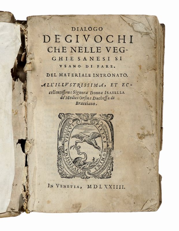 In-8° (mm 184x100). Pagine [16], 17-288. Marca con motto incisa in legno al frontespizio; alcuni capilettera, anch'essi xilografici, interni alle pagine. Mancanze marginali nella carta al frontespizio, un lavoro di tarlo nel margine interno delle carte che tocca in alcuni casi il testo, alcune macchie d'inchiostro. Legatura coeva in piena pergamena floscia con forso rivestito in carta decorata. Titolo manoscritto su tassello cartaceo al dorso. Mancanze al piatto anteriore.
