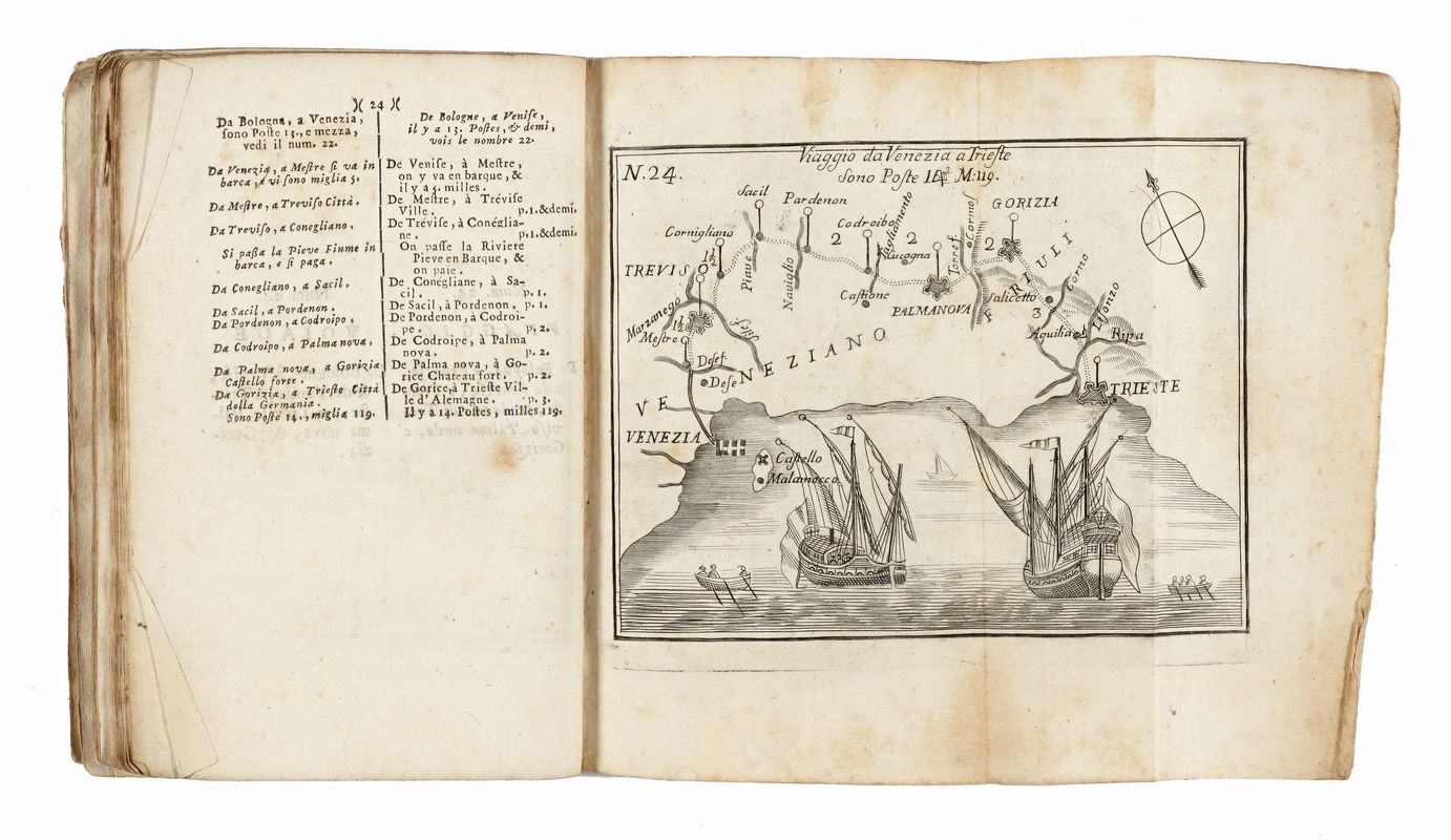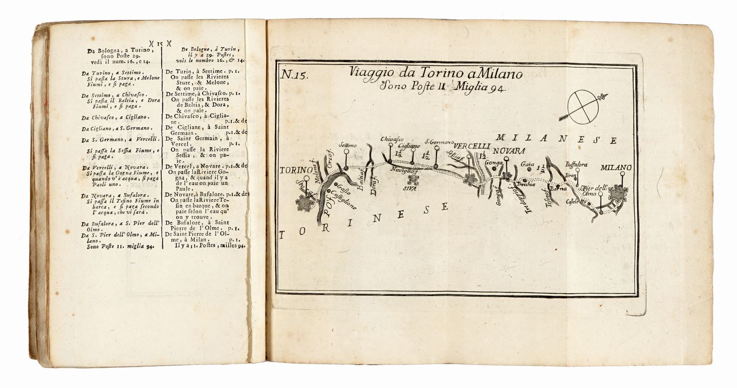 In-8° (mm 175x115). Pagine XII, con 24 carte di legenda che precedono 24 carte di tavole numerate 1-24 fuori testo, più volte ripiegate. Antiporta calcografica e doppio frontespizio, in italiano e in francese, con incisa in rame una vignetta con Spiegazione delle Cifre. Testo su due colonne, in italiano e francese. Fioriture, macchie e bruniture sparse, concentrate principalmente alle tavole. Cartonato rustico decorato, con pecetta di carta al dorso in parte mancante. Difetti alle cerniere. Ex-libri di carta parzialmente abraso al contropiatto anteriore.