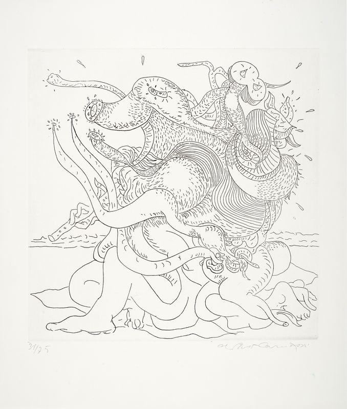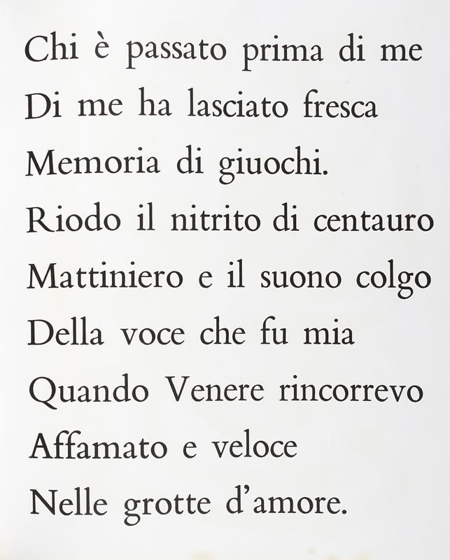 In-folio grande (mm 635x520). Carte [28]. Con 10 fotolitografie a colori di Arturo Carmassi fuori testo e cinque acqueforti protette da velina, due rilegate nel testo e tre sciolte firmate e numerate a matita dall'Artista. Bell'esemplare in barbe, con le acqueforti sciolte contenute entro cartella editoriale. Legatura editoriale in pieno cartonato, con disegno originale eseguito a mano ai piatti. Il tutto entro cartella originale in mezza tela, con piatti neri. Lievi difetti. Copia n. 31, una delle 75 in numeri arabi, su una tiratura complessiva di 105 esemplari numerati.