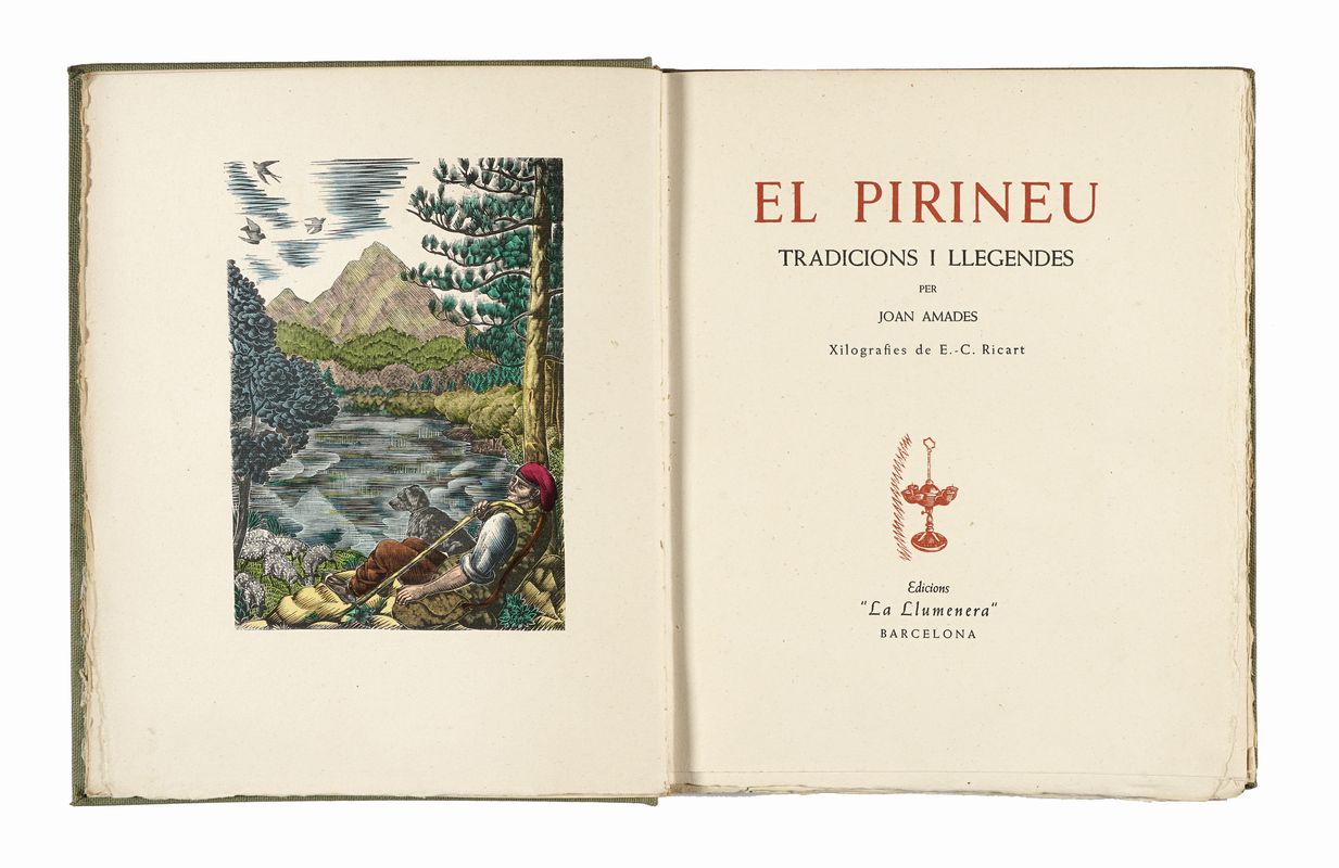 In-8° (mm 270x210). Pagine XV, [1], 167, [13]. Con un'antiporta fuori testo e 3 tavole xilografiche a piena pagina fuori testo, tutte in coloritura coeva. Numerose vignette, testatine e capilettera in coloritura. Ottimo esemplare in barbe. Legatura editoriale in piena tela con titoli in oro al piatto e al dorso. Esemplare n. 298, uno dei 250 su paper de tina, su una tiratura complessiva di 467 copie. SI AGGIUNGE: Id., Imatgeria popular Catalana. Els Goigs [...] Volum premier (-segon). Barcelona: Orbis, s.d. [i.e. 1939]. 2 volumi in-4° (mm 335x230). Legatura editoriale in piena tela con titolo entro tassello decorato al piatto anteriore e in bordeaux al dorso.