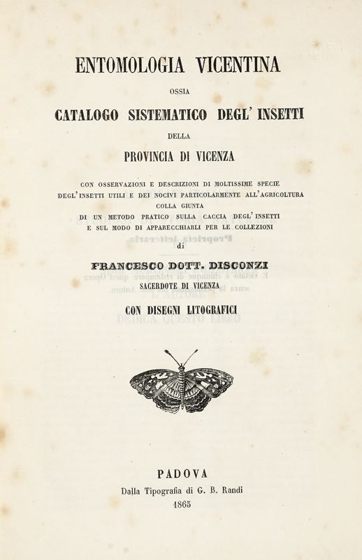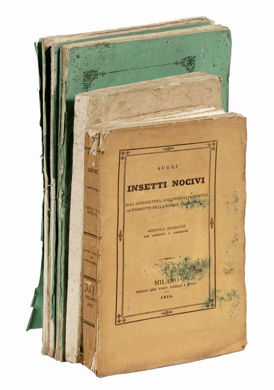 3 fascicoli in-8° grande (mm 250x163). Pagine 144 con 5 tavole fuori testo in fine; 145-232 con 6 tavole fuori testo in fine; 233-316 con 7 tavole fuori testo in fine. Con, nel complesso, 18 tavole in litografia rarriguranti insetti, api, farfalle, scarafaggi & co. Fioriture passim, buono stato complessivo. Brossura editoriale originale con titoli impressi al piatto anteriore di ciascun fascicolo. Mancanti parte dei dorsi, esemplari parzialmente sfascicolati. SI AGGIUNGONO: Gené Giuseppe, Sugli insetti più nocivi alla agricoltura... Milano: Ant. Fort. Stella e Figli, 1835. 1 volume in-8° (mm 190x120). Savani Luigi, Modo pratico per conservare le api e per estrarre il mele senza ucciderle... Milano: Giovanni Silvestri, 1811. 1 volume in-8° (mm 190x120).