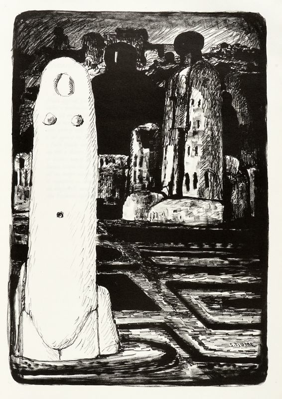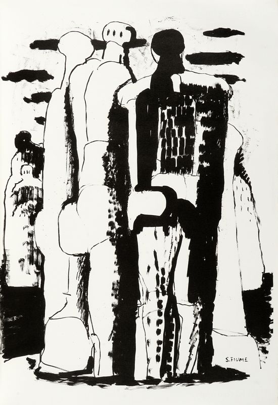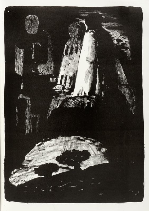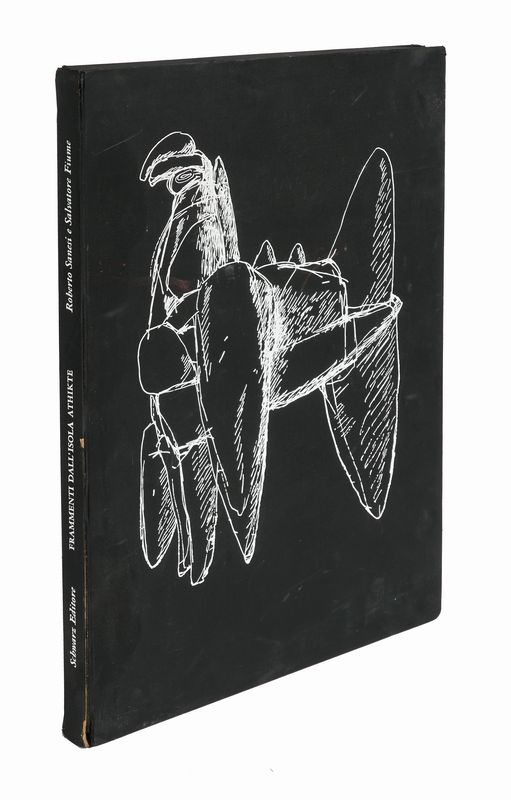 In-folio (mm 520x350). Pagine 67, [3] con 13 litografie originali a piena pagina nel testo di Salvatore Fiume in fogli sciolti. Conservato entro cofanetto editoriale in tela nera, illustrato e con titoli al dorso. Macchie di polvere ai piatti e difetti alle cerniere. Esemplare n. 38 su una tiratura a 110 copie, stampata con torchio a mano di Aldo Costa su carta delle Cartiere Miliani di Fabriano, con firme originali degli Autori, uno degli 87 in numeri arabi.