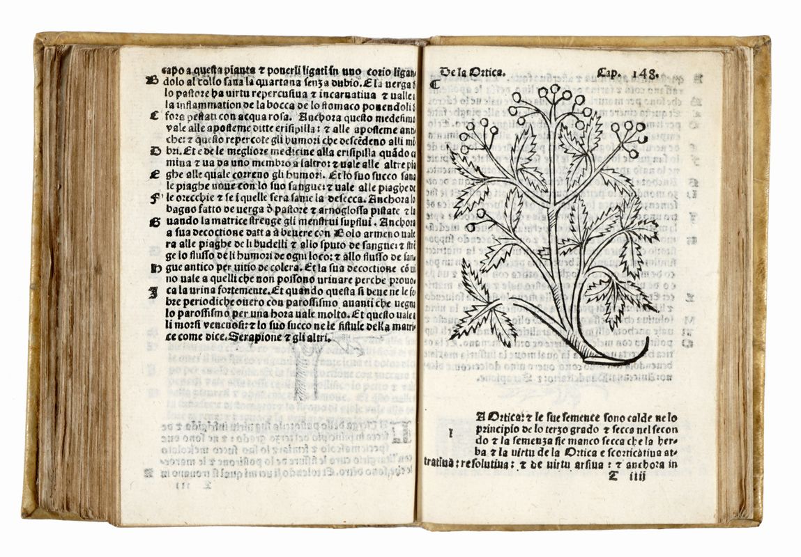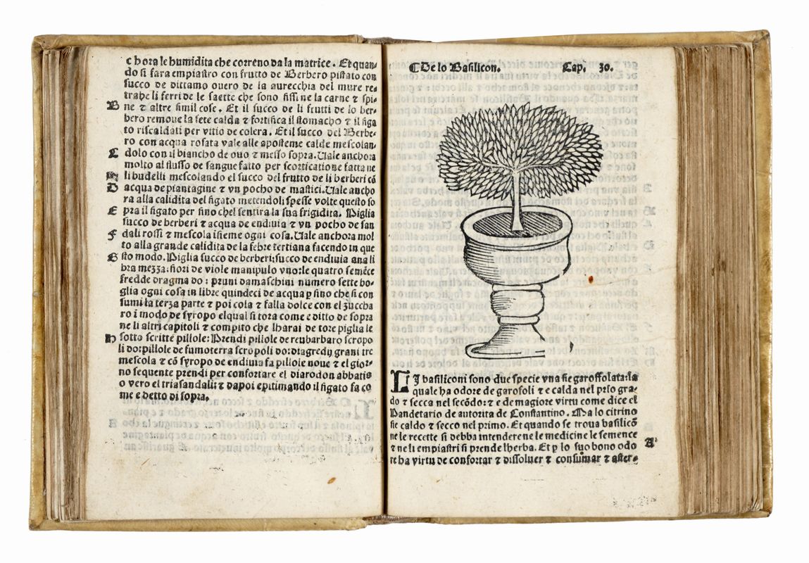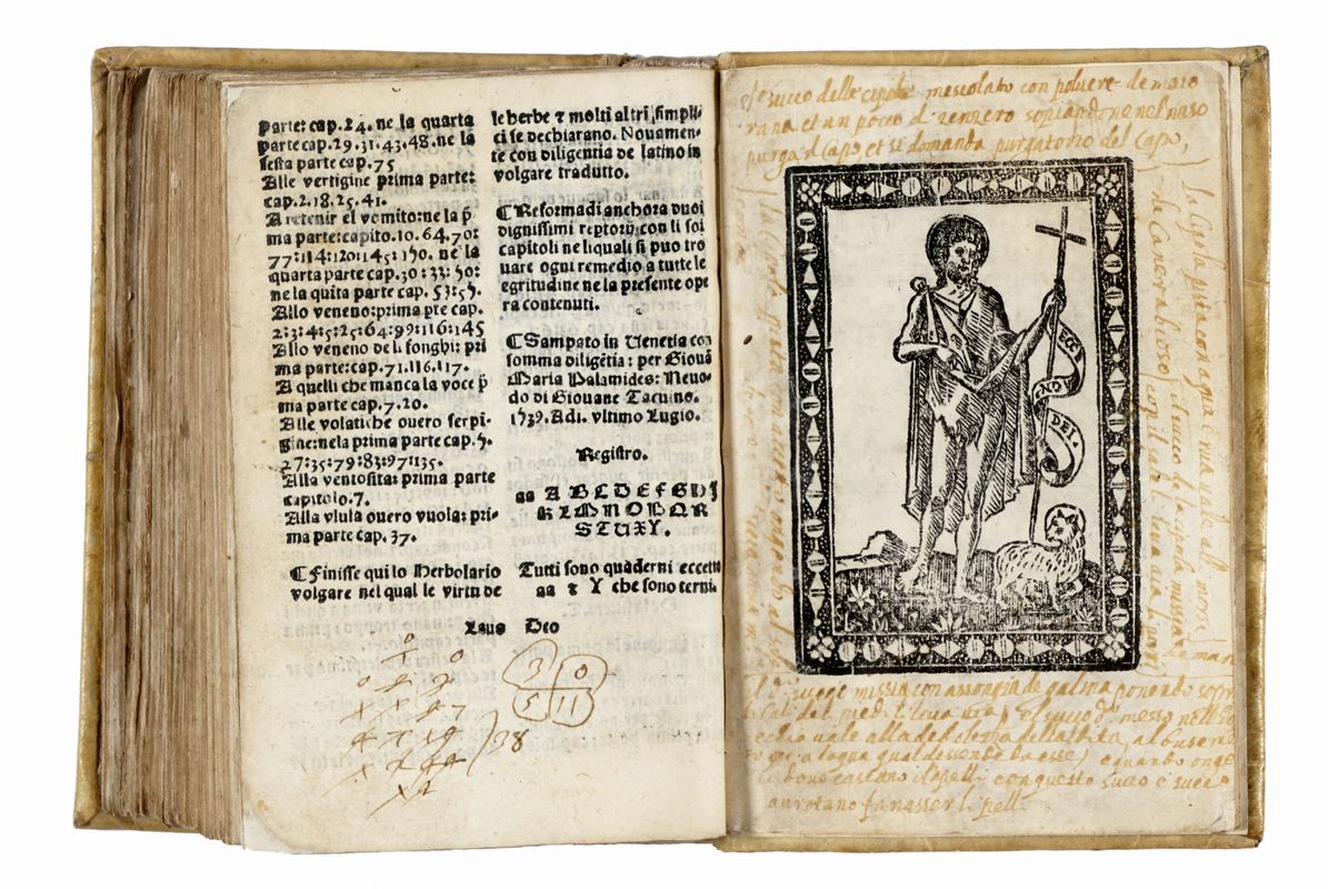In-8° (mm 152x100). Carte [6], 151, [23]. Con 150 illustrazioni xilografiche di piante a tre/quarti nel testo, 1 grande legno raffigurante i santi Cosma e Damiano al frontespizio con titoli impressi in rosso e nero con, 1 xilografia a piena pagina con l'Annunciazione a carta AA6v, 1 tavola raffigurante una cantina con botti, e 1 legno in fine raffigurante il Battista. Lievissime fioriture e piccoli strappetti marginali restaurati a rare carte, per il resto ottima copia. Legatura successiva in piena pergamena rigida con titolo manoscritto al dorso. Etichetta della libreria Il Polifilo al contropiatto anteriore, numerose note manoscritte al colophon.