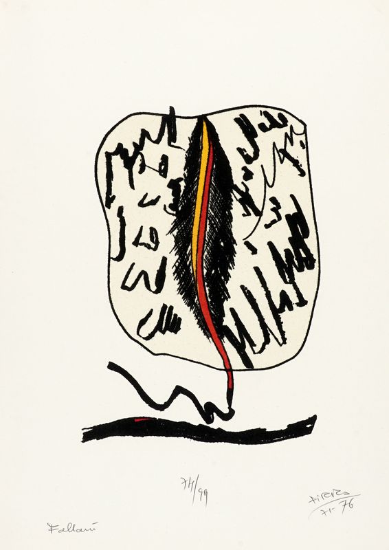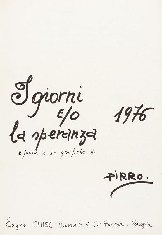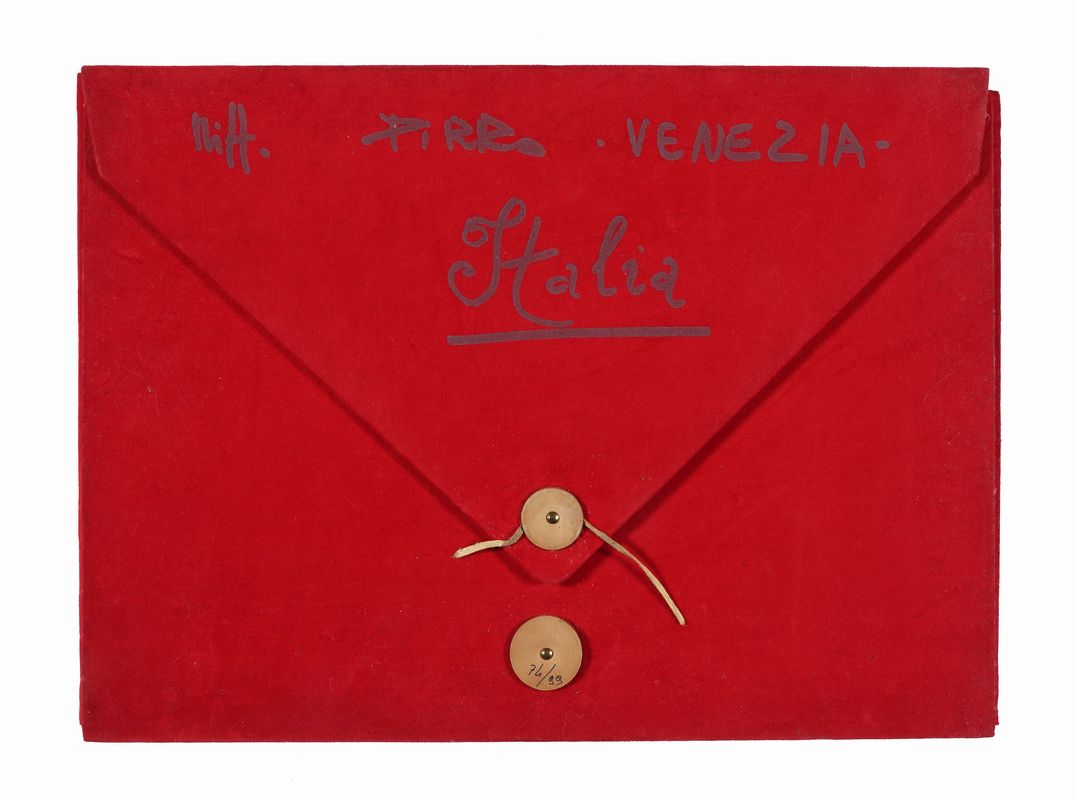 Cartella in-folio (mm 500x350). Contiene 1 bifolio e 10 serigrafie a colori, ciascuna firmata, datata e numerata a matita nel margine inferiore delle carte. Ottimo stato conservativo. Es. n. 74 su una tiratura complessiva di 99 copie. Cartella originale a busta rivestita in velluto rosso. Minime tracce d'uso, mancante il cordino di chiusura.