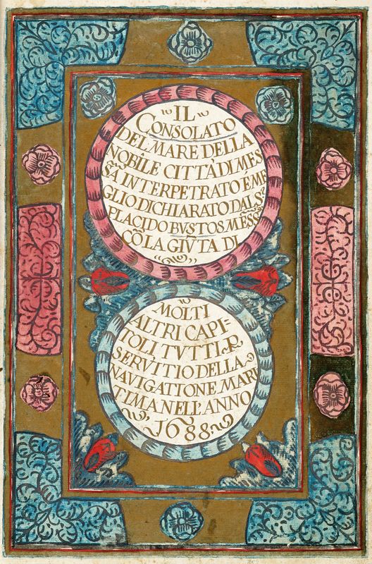 Manoscritto a inchiostro nero. Carte [15], 130 cui seguono varie carte bianche. Testo in italiano. Frontespizio decorato. Il titolo completo, racchiuso in due cerchi, è il seguente: “Il Consolato del mare della nobile città di Messina interpretato e meglio dichiarato dal S.r Placido Bustos messinese con la giunta di molti altri capitoli, tutti per servitio della navigazione maritima nell’anno 1688”. Al contropiatto è applicata una incisione (con difetti) che ritrae la Vergine Maria con il testo: “Noi Vergine Maria [...] humilissima Madre di Dio [...] salutiamo tutti i messinesi dandogli la beneditione di Dio Padre Onnipotente [...]” (al piede “Filippus de Marco sculpsit Messina 1688”. Il testo è così suddiviso: avvertenza per il lettore, indice (Tavole) e testo suddiviso in 234 capitoli del “Consolato del mare interpretati e dichiarati dal Sig. Placido Bustos”. Segue (a carta 127) altro testo relativo all’introduzione della “scala e porto franco” con la seguente intestazione: “D. Giovan Francesco Paceco Gomez de Sandoval Aragon Toledo Velasco Tellez [...] gentil huomo de la Camera di S. M. Tesorero perpetuo della Reali Case di moneta di Madrid, Vicerè, luogotenente, e Capitan Generale di questo Regno di Sicilia”. Tagli dorati. Legatura in pelle coeva con impressioni in oro e il titolo ai piatti “Il consolato di mare di Placido Bustos”. Dimensioni: 290x200 mm.