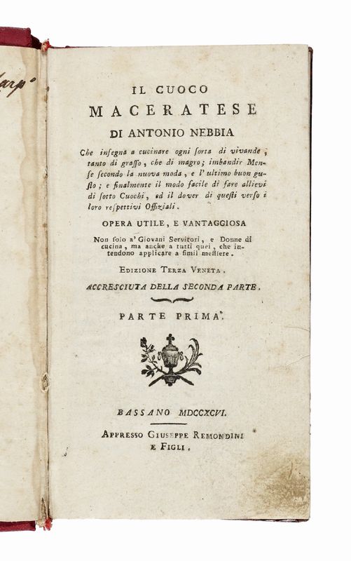 In-12° (mm 167x90). Pagine 299, [1]. Fregio xilografico al frontespizio. Diffuse fioriture, altrimenti buona copia. Legatura in mezza pelle con piatti in carta marmorizzata e titoli in oro al dorso. Minime mende. Annotazione di mano ottocentesca al verso del foglio di guardia anteriore. SI AGGIUNGE: Il cuciniere italiano moderno, ovvero l’amico dei ghiotti economi e dei convalescenti. Opera necessarissima [...] per chi vuole imparare l'arte del pasticciere, confetturiere, liquorista e diacciatore [...] Tomo I. Livorno: tipografia Vignozzi, 1832. In-12° (mm 170x100). Mancante il secondo tomo dell'opera.
