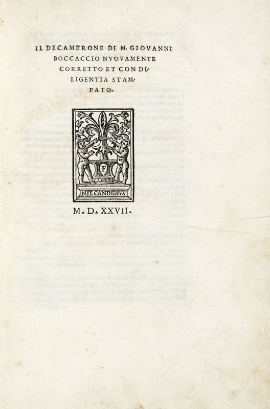 In-4° (mm 242x160). Carte [8], 284. Lavoro di tarlo marginale nelle prime 30 carte, che poi prosegue come piccolo forellino fino a carta 59, strappo a carta 221 che non interessa il testo ma copia marginosissima, fresca e ben impressa. Legatura coeva in piena pelle con titoli e decorazioni impressi in oro ai comparti del dorso, tagli rossi, Mancanze in corrispondenza delle cuffie, lise le cerniere, alcune tracce d'uso anche ai piatti. Applicato al contropiatto anteriore ex-libris Ginori Conti.