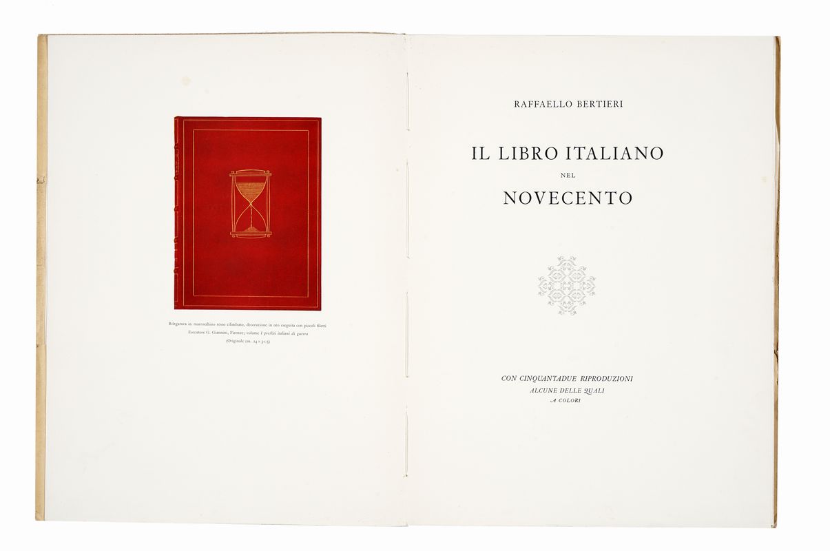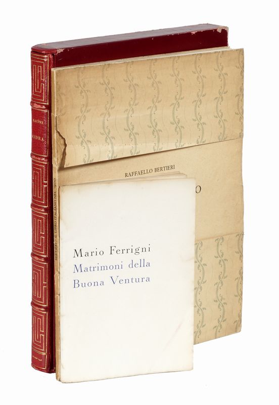 In-4° (mm 320x236). Pagine 46, [2]. Con 52 riproduzioni a colori e in bianco e nero nel testo, alcune a piena pagina. Brossura editoriale con titoli e fregi in nero e verde impressi ai piatti e al dorso. Un piccolo strappo al piatto anteriore, dorso brunito. SI AGGIUNGE: Racine Jean, Fedra. Versione di Rinaldo Küfferle. Milano: Istituto Grafico Bertieri, 1948. In-4° (mm 320x240). Pagine 135, [9]. Copia in barbe. Legatura in piena pelle rossa con decori geometrici impressi in oro ai piatti e al dorso. Sguardie e contropiatti in carta marmorizzata. Brossura editoriale conservata all'interno, con piatti e dorso. Custodia in cartonato rigido con difetti. Esemplare n° VI/220 per il Gen. Italo Nuzzolo. SI AGGIUNGE: Ferrigni Mario, Matrimoni della Buona Ventura. Asso: Raffaello Bertieri, 1935. In-8°(mm 204x138). Pagine [32]. In barbe. Brossura editoriale con titoli impressi in nero e blu al piatto anteriore. Lievi bruniture marginali.