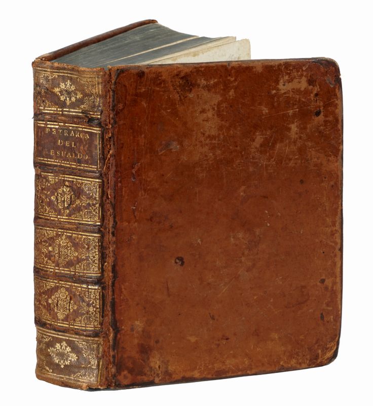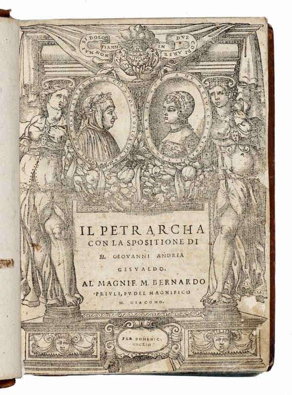 2 parti in 1 volume in-4° (mm 203x140). Carte [22], 346; [72]. Frontespizio interamente inciso con ritratto di Petrarca e Laura entro ovali. Ciascuna parte con proprio frontespizio, xilografie in principio di ciascun Trionfo. Piccole mancanze restaurate al frontespizio, occasionali carte brunite e alcuni strappetti marginali. Leggermente corto di margini. Legatura in piena pelle con titoli e decorazioni impresse in oro ai comparti del dorso, tagli blu. Mancanze lungo le cerniere e in corrispondenza degli angoli.