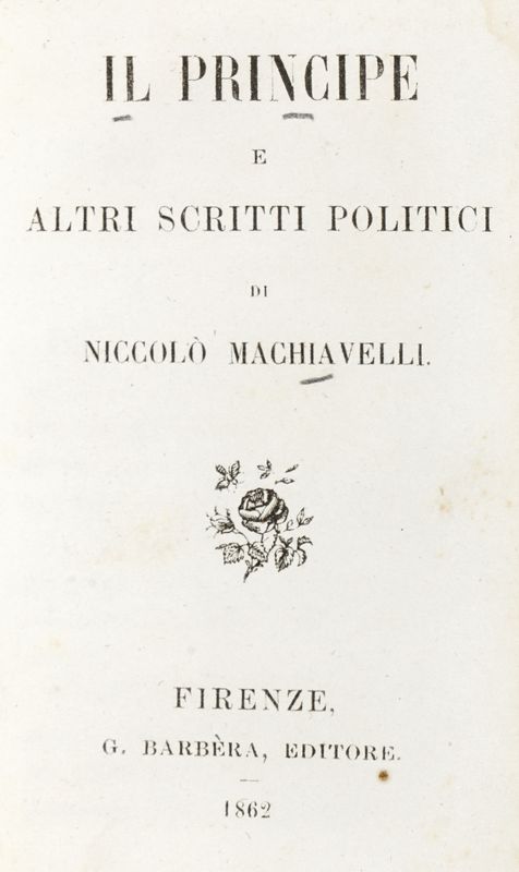 In-24° (mm 96x60). Con 1 ritratto di Machiavelli in antiporta. Esemplare lievemente gorato. Legatura in mezza tela con punte e piatti in carta decorata. Titolo in oro al dorso.