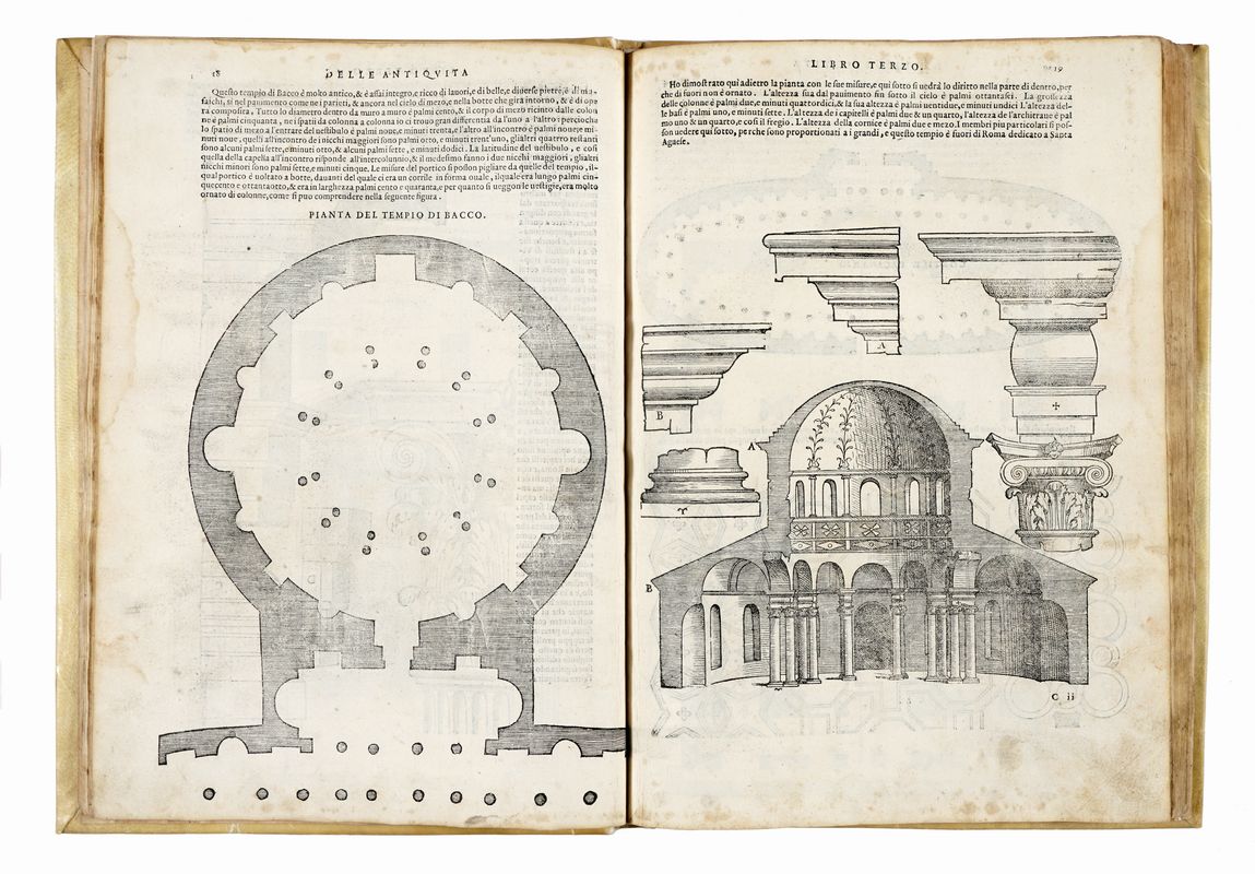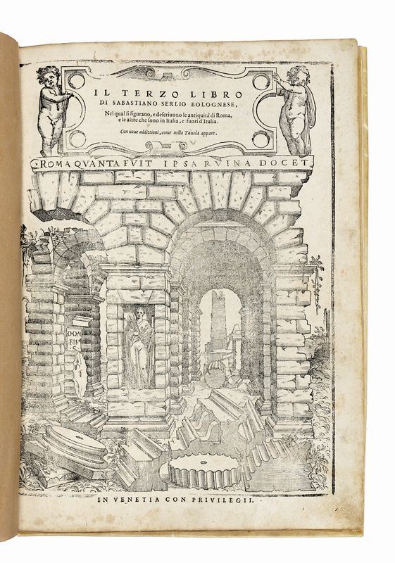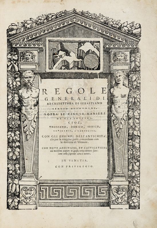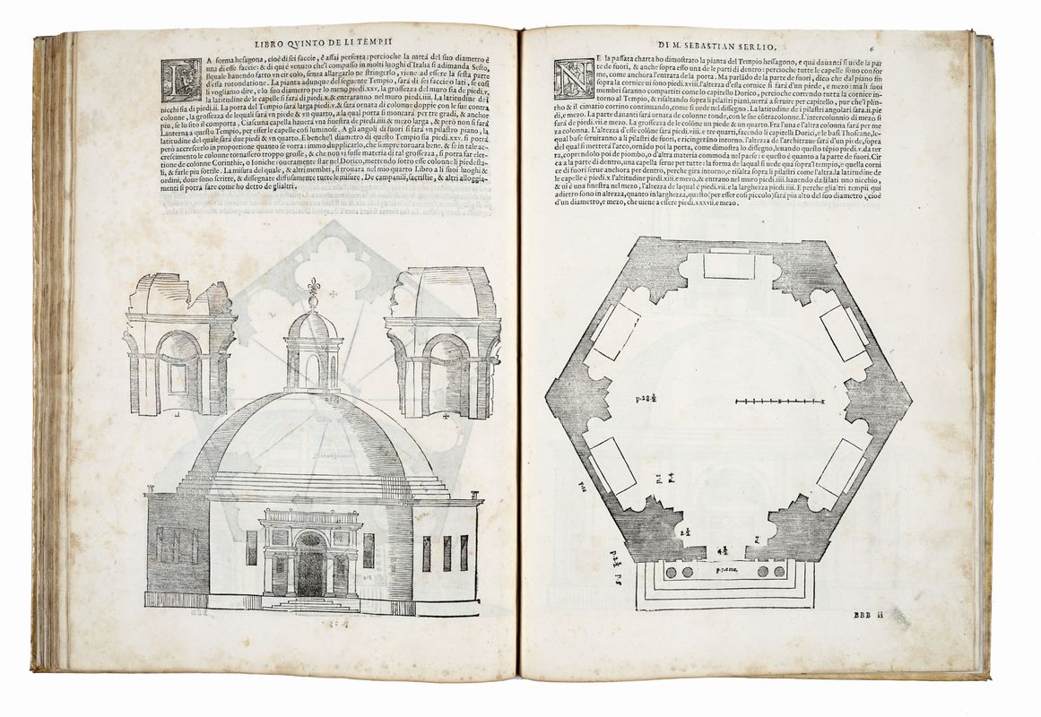 In folio (mm 340x240). Pagine 151, [1]. Alcune gore marginali, fioriture e tracce d'uso. Legatura moderna in piena pergamena muta. SI AGGIUNGE: Id., Regole generali di architettura [...] Quinto libro d'architettura. (Al colophon:) In Venetia: appresso Gio. Battista, et Marchio Sessa, fratelli, 1559. 2 parti in 1 volume in folio (mm 338x243). Carte 74; 18. Frontespizio architettonico a entrambi i volumi, numerosissime illustrazioni in legno a piena pagina. Nella prima parte restaurato il margine delle carte 26-27-30-31, alcune macchie d'inchiostro, sporadiche fioriture marginali. Nel secondo, alcune carte brunite e macchioline. Legatura successiva in piena pergamena rigida con titolo manoscritto al dorso. Sguardie rinnovate.