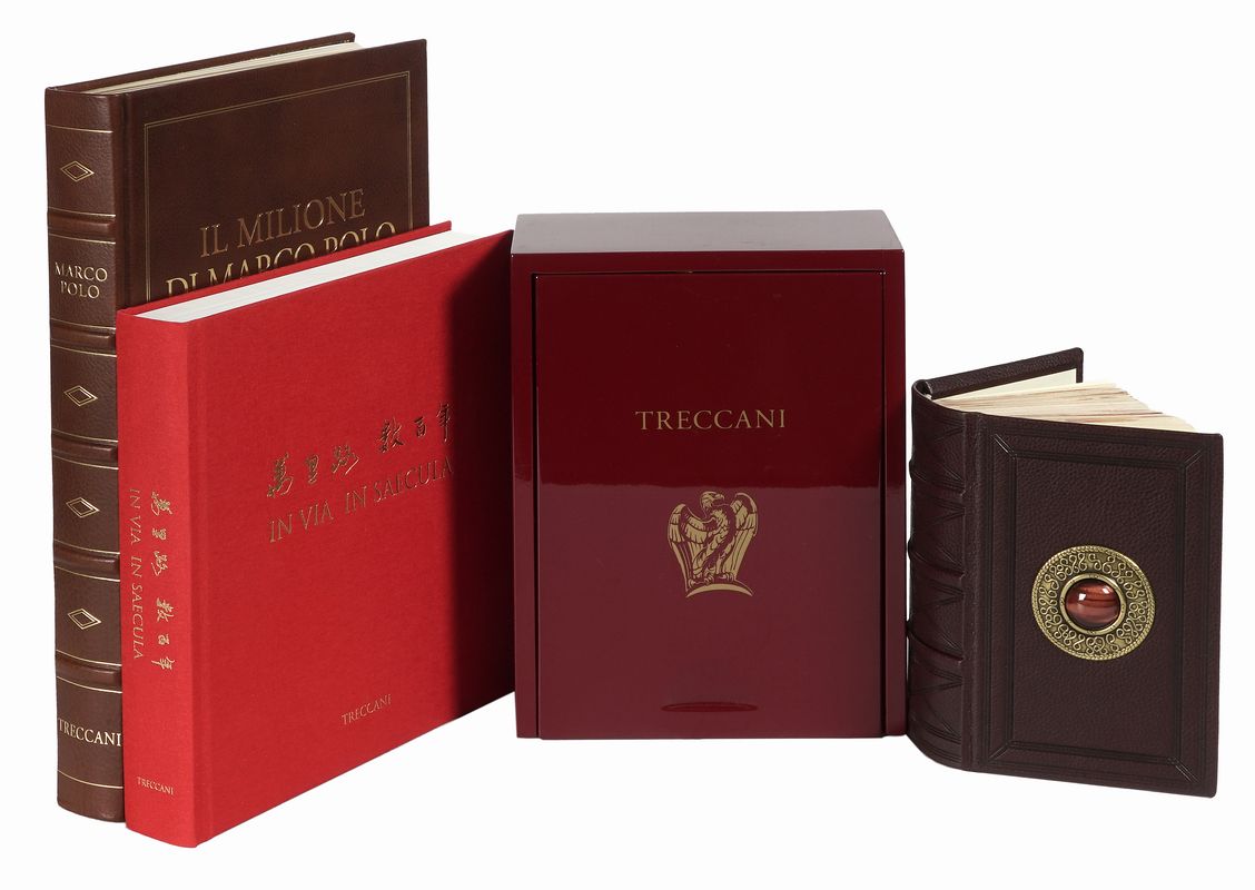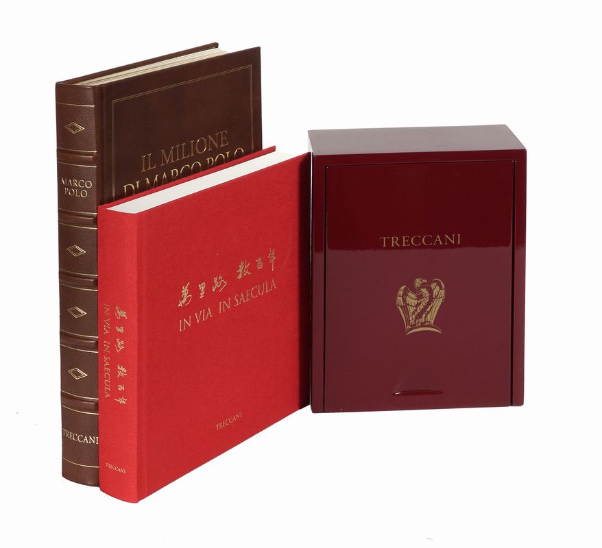 In-8° (mm 240x230). Pagine XLIV, 420. Opera riccamente illustrata, a colori e in bianco e nero nel testo. Legatura editoriale in piena tela rossa, con titoli in oro al piatto anteriore e al dorso. Con l'edizione facsimile del manoscritto Pluteo 3 capsula 1, della La Bibbia di Marco Polo, conservato presso la Biblioteca Medicea Laurenziana di Firenze. Bella legatura editoriale in piena pelle, entro cofanetto originale in plastica dura bordeaux con illustrazioni in oro al piatto superiore. Ottimo stato di conservazione. SI AGGIUNGE: Il Milione di Marco Polo nell'edizione di Giovanni Battista Ramusio [...]. Con le illustrazioni di Mimmo Paladino. Roma: Istituto della enciclopedia italiana fondata da Giovanni Treccani, 2012. In-4° (mm 335x210). Esemplare in perfetto stato di conservazione, con numerose illustrazioni a colori, a piena pagina, di Mimmo Paladino. Legatura editoriale in piena pelle con titoli entro duplici cornici di filetti dorati al piatto e al dorso a 5 nervi. Esemplare 270 su una tiratura complessiva di 1499 copie, uno dei 350 distribuiti in abbinamento al facsimile del Pluteo 3 capsula I detto La Bibbia di Marco Polo.