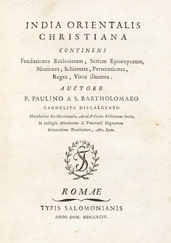 In-4° (mm 238x170). Pagine XXIV, 280. Con due incisioni a piena pagina nel testo. Mancante la carta geografica ripiegata fuori testo del Malabar. Monogramma tipografico in legno al frontespizio e in fine; ritratto dell'Autore alla carta a1r. Esemplare diffusamente fiorito, con un'ampia integrazione cartacea all'occhietto. SI AGGIUNGONO: Valsecchi Antonino, La religion vincitrice... Parte prima. In Napoli : nella stamperia di Giuseppe de Dominicis, 1777. Dei fondamenti della religione e dei fonti dell'empietà. Tomo II (-III). In Napoli: nella stamperia di Giuseppe de Dominicis, 1774; Bernini Domenico, Istoria di tutte l'eresie […] compendiata ed accresciuta da Giuseppe Lancisi [...]. Tomo I (-IV). In Roma: per Girolamo Mainardi, 1726-1733. 4 volumi in-12° (mm 235x170); Fuligatti Giacomo, Vita del cardinale Roberto Bellarmino della Compagnia di Giesù. In Roma: appresso l'herede di Bartolomeo Zannetti, 1624; Leti Gregorio, Conclavi de' pontefici romani. S.l.: s.e., 1667.
