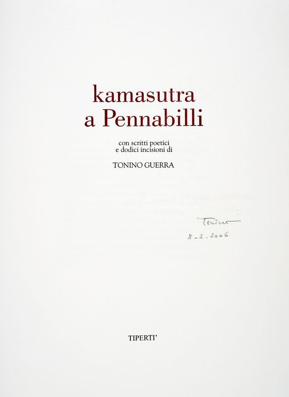 In-folio (mm 470x360). Con 1 carta di frontespizio, 2 di testo, 1 di colophon e 12 belle incisioni a colori a tema erotico, numerate e firmate a matita dall'Artista, ciascuna entro bifolio sciolto, in barbe, e con testo al recto della prima carta. Entro cartella editoriale in piena tela rossa, con titoli in nero al piatto e al dorso. Esemplare senza numerazione, di una tiratura complessiva di 130 copie.