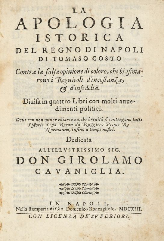 In-4° (mm 196x143). Pagine [20], 168. Macchie nel margine interno delle carte e occasionali fioriture, nel complesso buono stato. Legatura successiva in piena pelle bazzana con titolo e decorazioni impressi in oro al dorso. Assente parte della cuffia superiore, altri minori difetti.