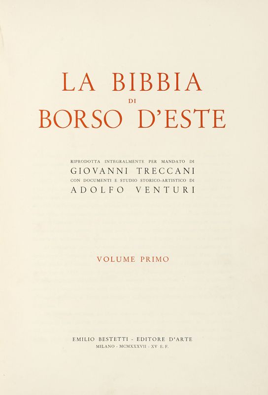 2 volumi in-folio (mm 410x295). Bella legatura editoriale in piena pelle rossa, con impressioni in oro al dorso e stemma in bronzo sbalzato entro cornice dorata al piatto anteriore; taglio superiore in oro e sguardie in bella seta bordeaux con impressioni dorate. Esemplare senza numerazione, con la dedica autografa di Giovanni Treccani alla giustificazione datata Milano, 15 maggio 1937.