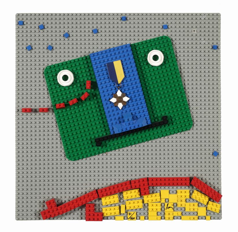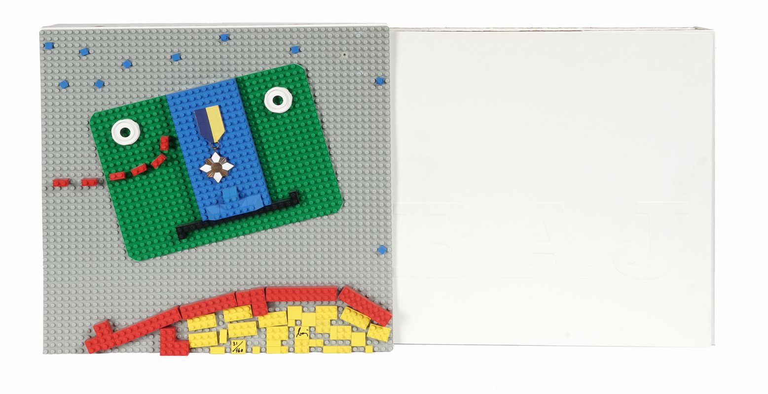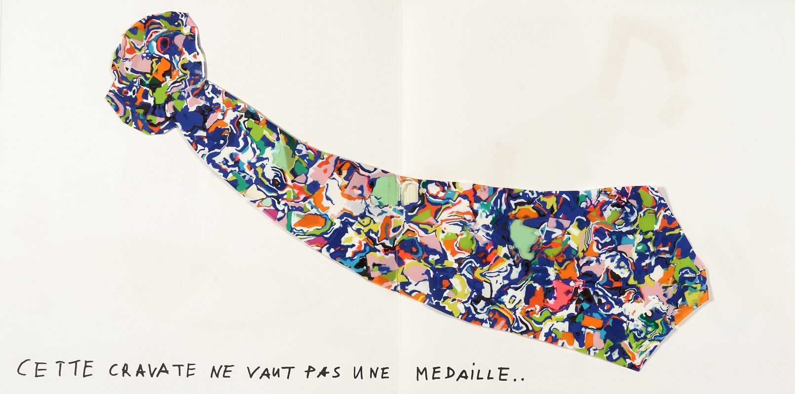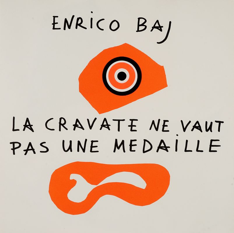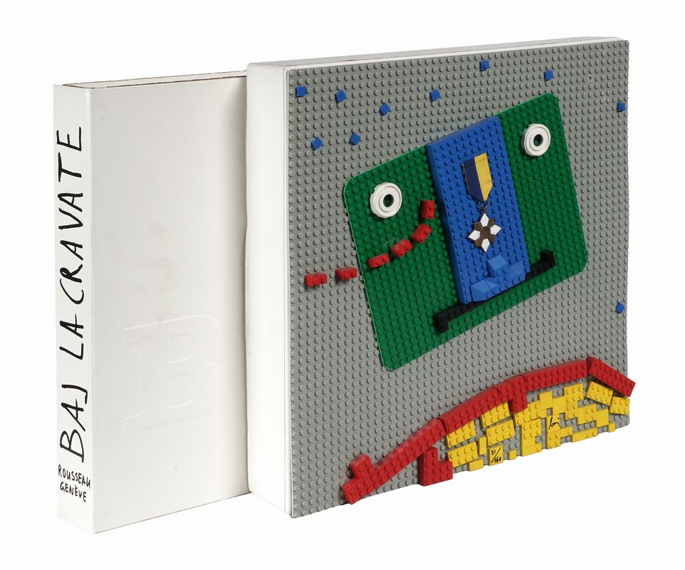 In-folio (mm 380x380). Carte [40]. Con tre collage numerati e firmati a matita da Enrico Baj e un collage su cartoncino nero, il tutto sciolto e fuori testo. Esemplare a bifoli sciolti, stampati in serigrafia e litografia a colori, con molti interventi manuali a collage nel testo, incluso quello su due pagine con la cravatta in platica multicolore, che dà il titolo all’opera. Staccato, ma presente, il collage de Les demoiselles d'Avignon; con tracce di colla uno dei 4 collage, altrimenti buona copia in barbe. Cartella in cartone editoriale con grande tassello cartaceo al piatto anteriore, entro chemise in cartone rivestito in similpelle bianca, con il nome dell'Artista in rilievo al piatto anteriore e titoli in nero al dorso. Il tutto in custodia originale in simipelle bianca, con un bellissimo multiplo in LEGO numerato 31/160 e firmato dall'Artista al piatto anteriore. Staccato, ma presente, il piccolo lego nero al piatto anteriore, e con lievissime tracce di patafix rimovibili. Esemplare n. 31 su una tiratura complessiva di 200, uno dei 30 contenenti un collage numerato da 1 a 40 e due collage numerati da 1 a 75.