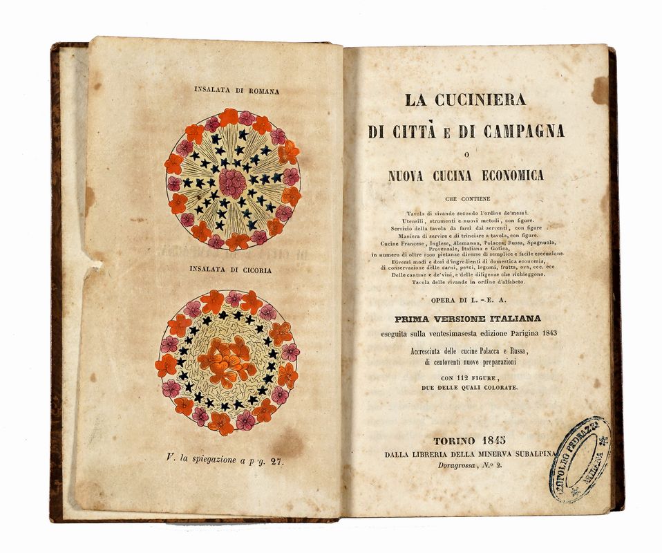 In-8° piccolo (mm 180x100). Pagine [26], 9-524. Con un'antiporta fuori testo in coloritura e numerose illustrazioni nel testo. Esemplare con forti e diffuse fioriture, macchie e gore sparse. Legatura coeva in piena pelle muta, con difetti alle cerniere. SI AGGIUNGE: Il cuoco piemontese ridotto all'ultimo gusto e perfezione con nuove aggiunte ad uso anche della nostra Lombardia che insegna facilmente a cucinare qualunque sorta di vivande sì in grasso, che in magro... Milano: presso Pietro Agnelli in S. Margarita, s.d. [i.e. 1815]. In-12° (mm 160x95). Esemplare fiorito, con sporadici aloni, scompleto delle 3 tavole ripiegate fuori testo. Legatura in mezza pelle, con titoli in oro su tassello al dorso e tagli spruzzati. Mancanze agli angoli e alle unghiature. SI AGGIUNGE: Peruzzotti Attilio, 366 liste cibarie variate per pranzi già combinate secondo i giorni e relative stagioni dell'anno... Milano: Bietti, s.d [i.e. 1909 ca]. In-8° (mm 200x132). Legatura originale con titoli e illustrazioni al piatto anteriore e al dorso. Esemplare con numerosi difetti interni.