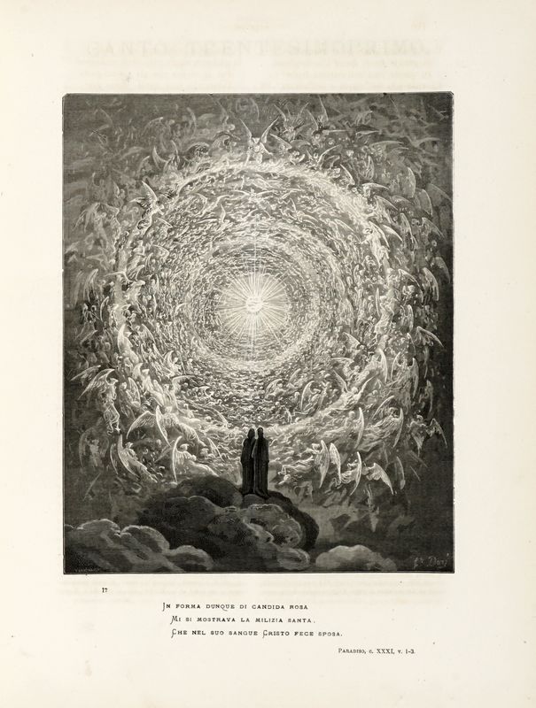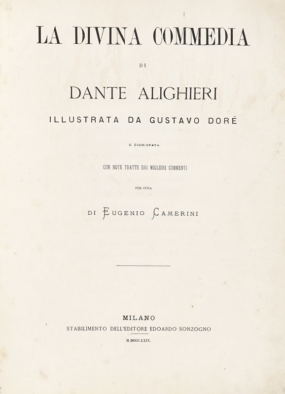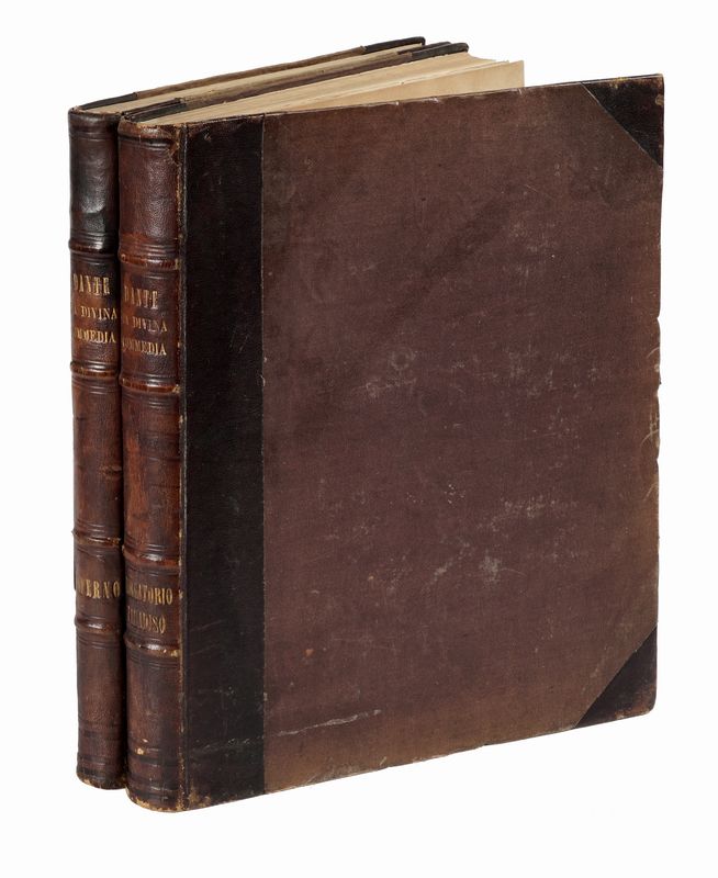 3 parti in 2 volumi in folio (mm 388x290). Pagine [2], X, [2], 138 con 1 ritratto di Dante in antiporta e 75 tavole fuori testo, talvolta protette da velina; VIII [i-e. VI], 134; [4], 132, [4] con 60 tavole fuori testo. Esemplare marginalmente gorato, con alcuni strappetti e fioriture. Legatura coeva in mezza pelle con punte e piatti in tela. Titoli in oro al dorso. Tracce d'uso a piatti e cerniere.