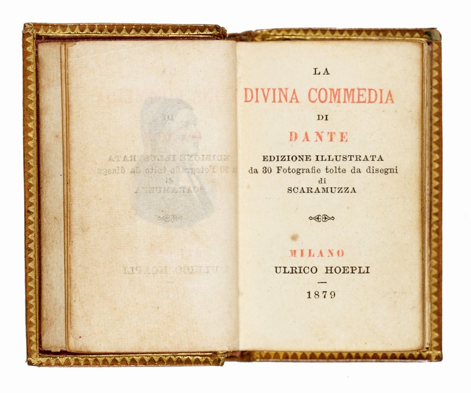 In-128° (mm 50x30). Titolo stampato in inchiostro rosso e nero. Con, fuori testo, 1 ritratto di Dante in antiporta e 30 fotografie montate su carta riproducenti disegni di Scaramuzza. Legatura coeva in piena pelle con ovale centrale circondato da gigli stilizzati e cornice di filetti dorati ai piatti, titoli in oro su tassello al dorso a 4 nervi, unghiature a dentelles, tagli dorati e sguardie in bella carta e seta bordeaux con motivi fitomorfi dorati. Esemplare n. 12/51, con la firma di Ulrico Hoepli.
