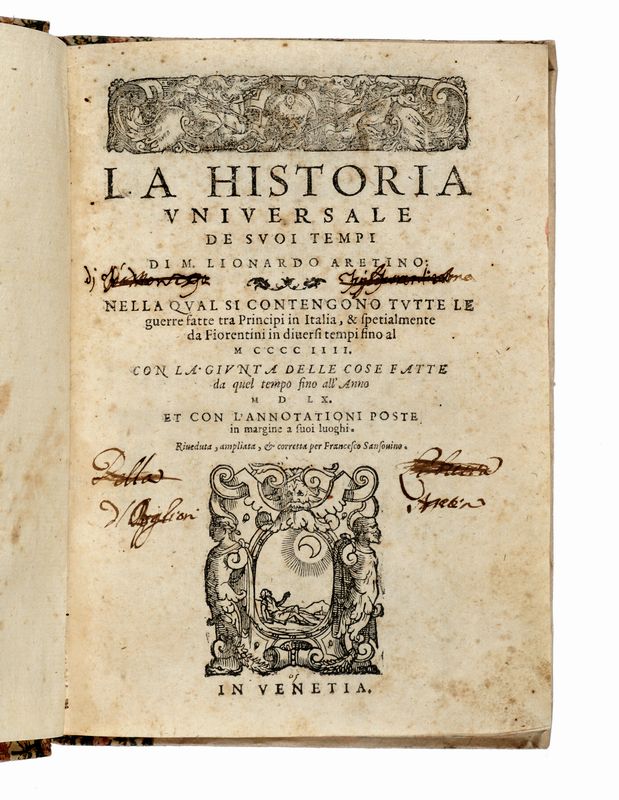 In-4° (mm 195x145). Carte [6], 236, [8]. Testatine, capilettera e finalini. Fioriture, alcuni fascicoli bruniti. Legatura successiva in cartonato con dorso rivestito in carta decorata e titolo manoscritto su tassello cartaceo al dorso. Sguardie spruzzate. Ex-libris Ginori-Conti applicato al contropiatto anteriore, nota di possesso cassata al frontespizio.
