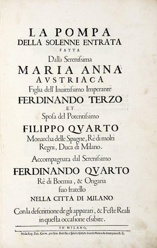 In folio (mm 410x265). Pagine [6], 65, 1 bianca con 19 [di 20] tavole fuori testo, alcune a doppia pagina, tutte incise in calcografia. Copia priva dell'antiporta incisa e di una delle tavole, con ricostruzione dell'angolo inferiore esterno della carta 12. Legatura in piena pergamena floscia. Macchie ai piatti.