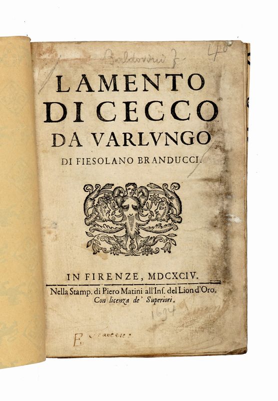 Prima edizione, In Firenze: nella stamp. di Piero Matini all'Ins. del Lion d'Oro, 1694.