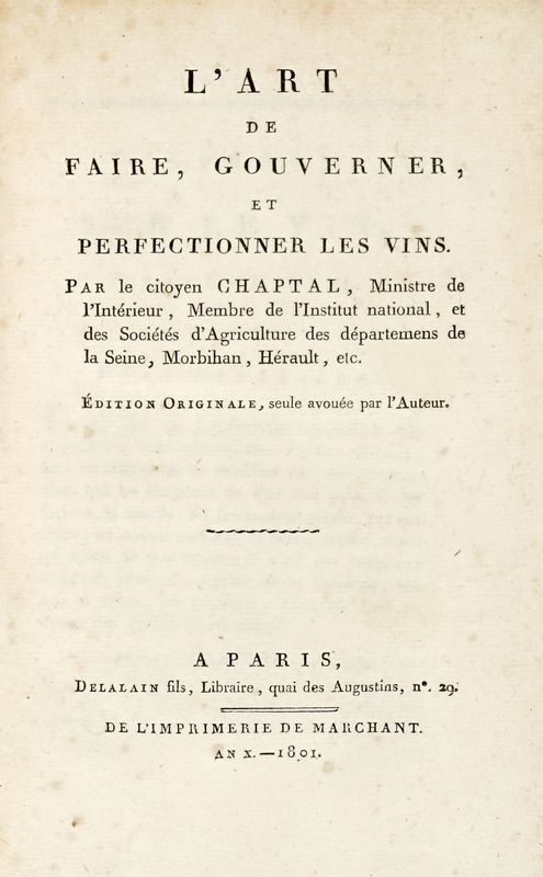 In-8° (mm 215x315). Pagine [4], 192 [i.e. 190], [2]. Esemplare all'origine privo del fascicolo K, sostituito con un fascicolo dell'opera Traité sur le culture de la vigne dello stesso anno. Sporadiche fioriture. Brossura coeva in piena carta azzurrina. Alcune macchie ai piatti.